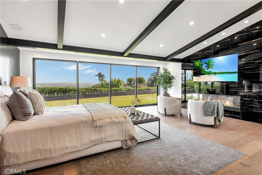 Private and gated, this reimagined single-story home sits on over half an acre, capturing spectacular harbor, city, and ocean views that unfold the moment you arrive. Beautifully renovated with an emphasis on sophistication and quality, the home features new electrical, plumbing, HVAC, Milgard/Western windows, Tesla solar, and two EV chargers. Modern systems supporting timeless design. An oversized glass pivot door opens to a light-filled, open floor plan where wide-plank hardwood floors, floor-to-ceiling sliders, and a striking two-way glass fireplace compliment the ever-changing views. Just beyond the walls of glass, a sprawling grassy play yard stretches out, ideal for children, pets, and relaxed outdoor gatherings, creating a seamless indoor-outdoor flow. The chef’s kitchen anchors the space with black-and-white Dalmatian marble, a generous island, Rohl fixtures, and a full suite of Viking appliances including a 6-burner range, double ovens, Sub-Zero refrigerator, and dual dishwashers. Two separate bedroom wings offer privacy and flexibility. The harbor-view primary suite is a retreat of its own, featuring a fireplace, vaulted beams, spa-style bath with soaking tub and skylight, and a custom walk-in dressing room. The secondary wing provides four additional bedrooms or adaptable office and gym space. A large laundry room with dual Samsung washer/dryer sets adds everyday convenience. The detached 540± sq ft ADU has a bedroom, kitchen/dining area, and mini-split HVAC offering ideal space for guests, multigenerational living, or rental use. A rare combination of privacy and views, this turn-key home offers a refined yet relaxed coastal lifestyle.