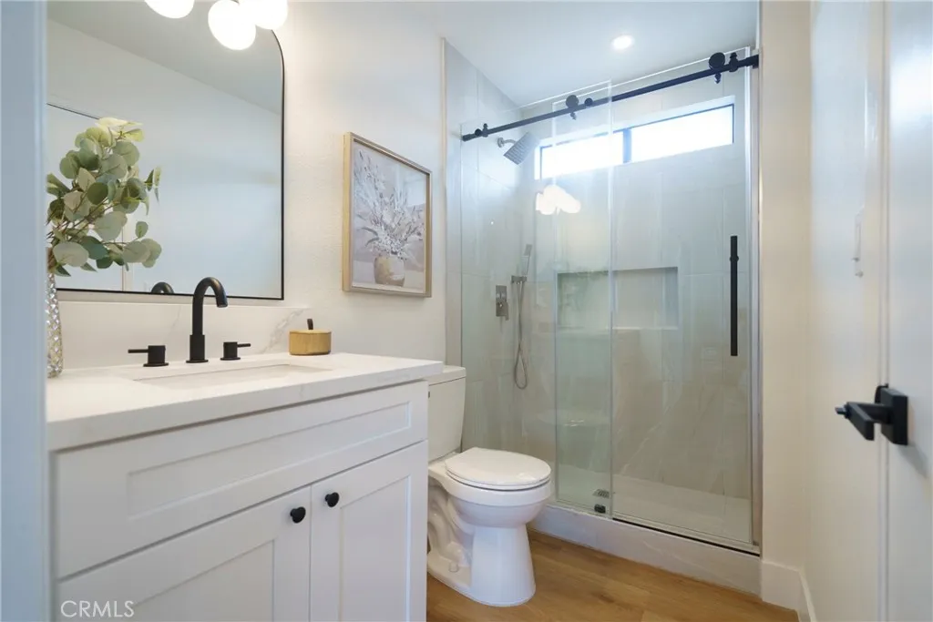 lighting. The primary bath offers a sleek new tile shower and vanity, while the downstairs half bath features a stylish new vanity as well. The primary suite boasts