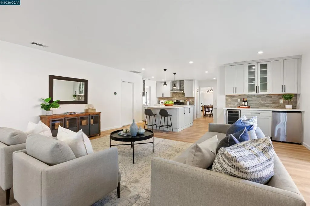 Situated on one of the largest flat lots in Gregory Gardens at the end of a cul-de-sac, this beautifully remodeled single-story home offers exceptional indoor-outdoor living, modern upgrades, and rare future flexibility on an expansive .37± acre lot. The completely remodeled open-concept kitchen serves as the heart of the home, featuring custom cabinetry, quartz countertops, stainless steel appliances, farmhouse sink, and a large center island with seating. The remodeled primary suite offers a true retreat, complete with a spacious walk-in closet and a beautifully updated en-suite bathroom featuring dual vanities and a walk-in shower. A 273± sq ft sunroom expands the total living space to approximately 2,155± sq ft, offering exceptional flexibility as a secondary living area or bonus room with direct access to the backyard. The expansive, level backyard presents endless potential—ideal for a future ADU, home expansion, resort-style outdoor living, or simply enjoying the rare space and privacy. Additional highlights include owned solar for energy efficiency and long-term savings and a EV plug located in the garage. Ideally located near the Contra Costa Canal Trail, parks, schools, and just minutes to BART, Highway 680, and downtown Pleasant Hill. Open Sat 1-4 and Sun 12-2!
