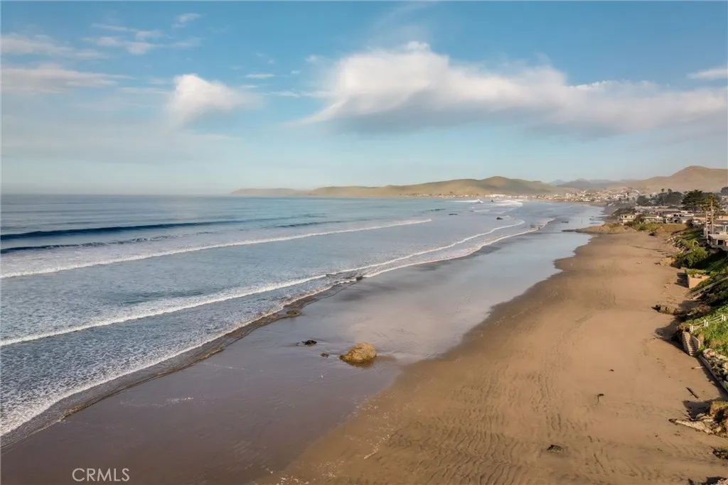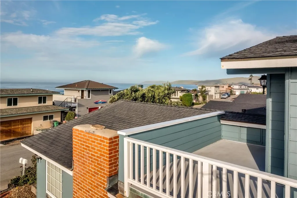 Directly across from the beach, this prime corner property captures ocean views from the upstairs deck and delivers classic Cayucos charm with standout curb appeal. Blue shiplap siding, crisp white trim, a brick chimney, and a bold red front door create a striking first impression.