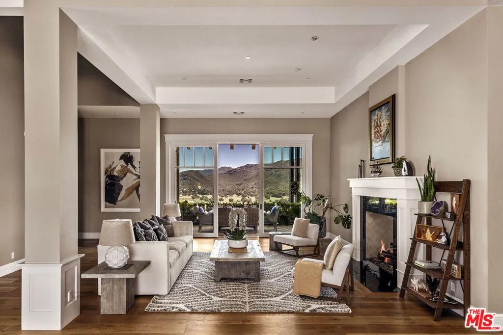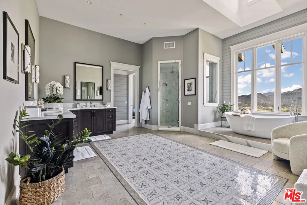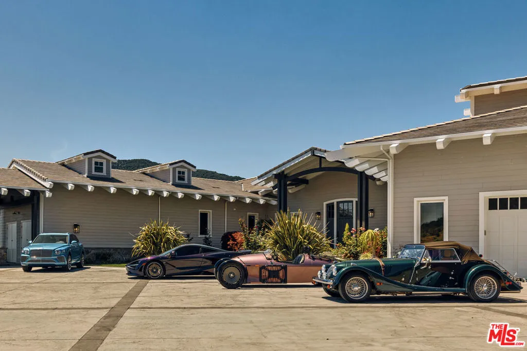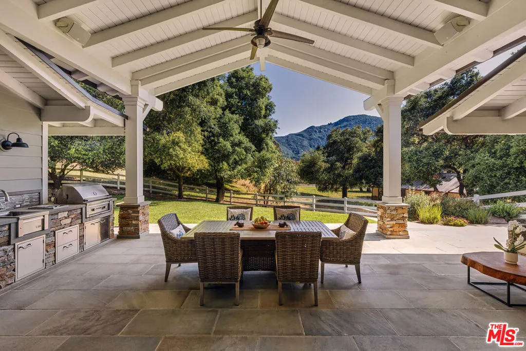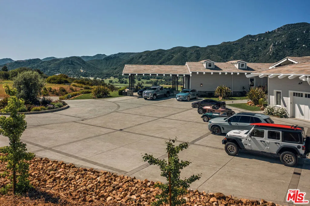 1697 Potrero Road and its breath-taking views sits behind twin, dove-white, four-rail fencing. Beyond its gated entrance lies a private lane that meanders its way uphill. Bordered by beds of wild flowers, clusters of lavender, pockets of iris and bursts of crimson bottlebrush, this is a journey that celebrates flora and fauna. At its summit, the lane opens onto a dramatic courtyard, with breath-taking, sweeping views. One of the newest homes in prestigious Hidden Valley, this is a grand and unique hybrid of traditional Cape Cod architecture and contemporary Californian lifestyle. The path to the front door is flanked by a car collector’s garage-cum-gallery and a vista-framing car port. With ceilings that reach 29ft, and a view upon entry from one end to the other, the scale of this house is magnificent. Pass the owner’s study, and enter the open plan great room, finding the dining area to the right and living room to the left. With pillared, vaulted ceilings, an abundance of natural light, the coziness of a roaring fire, as well as retracting glass doors to an external dining area, this is a home that offers indoor-outdoor living without constraint, and that can be formal or familial, and everything in between. The family room features a chef’s kitchen, top-of-the-range appliances, peninsula high-top seating, lounge area, fireplace, under those same soaring ceilings, and it (and the games room) boasts pocket glass doors that stand 10ft high. These retracting walls of glass offer phenomenal views over the valley and Santa Monica mountains ahead, and provide direct access to the vast outdoor entertaining areas and gardens. This covered patio features a full working kitchen, barbecue, wet bar, island, and fire pit. Beyond the family room is a games and entertaining room, with multiple televisions, arcade games, ample space for ping-pong or pool, also offering unparalleled views of sunsets, rolling hills, and the gardens, mountain ranges and estates below. The bright and spacious primary suite offers equally primary views, a lounge and bar area, luxurious spa-like bathroom, gym, walk-in closet, and its own laundry. With a private terrace off the main bedroom, perfect for sunrise breakfasts, this is a suite to behold. The two story, west wing features five further bedrooms, four en-suite, two lounge areas, a kitchenette, terrace, and direct access to the rear garden and volleyball/badminton green. The main house features a salon, laundry, and walk-in pantry, as well as a guest’s powder room. The landscaped gardens are as adept at offering a place to relax and admire the views, as they are at hosting a game of croquet, boules, or even for some decompressing yoga overlooking the neighboring vineyard. En route to the guest house, sits the repurposed bull-pen. This charming, octagonal structure, with its own distinct vantage point and abundance of natural light, is currently used as an artist’s studio. The guest house has been constructed, equipped, and decorated to the same exacting standards as the main house. The house features the blue stone, architectural details, soaring ceilings, and feel of the main house, yet delights in a very different setting, nestled amongst the trees. The 1,789sq ft guest house features one main entertaining room, a galley kitchen, two en-suite bedrooms, and one further bathroom; as well as a covered, outdoor kitchen, barbecue, lounge and dining area, measuring approximately 1,000sq ft. The guest house’s landscaped rear garden leads to fully rebuilt and beautifully restored stables. Offering a reception room, tack room, hay loft, and five stalls, these exquisite stables would bring a smile to the face of any equine enthusiast. This magical estate is like no other: unique in its architectural magnificence; privileged in its elevated vantage point; maximizing the use of its uninterrupted 360 degree, sweeping views; impeccable in its design, construction, and landscaping; and a rarity being such a new home.