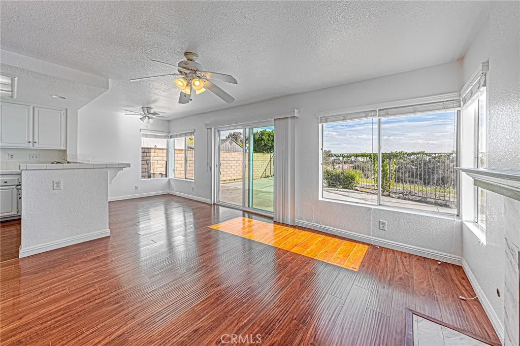 Kitchen and family room area features a fireplace, ceiling fan, breakfast bar and nook area.