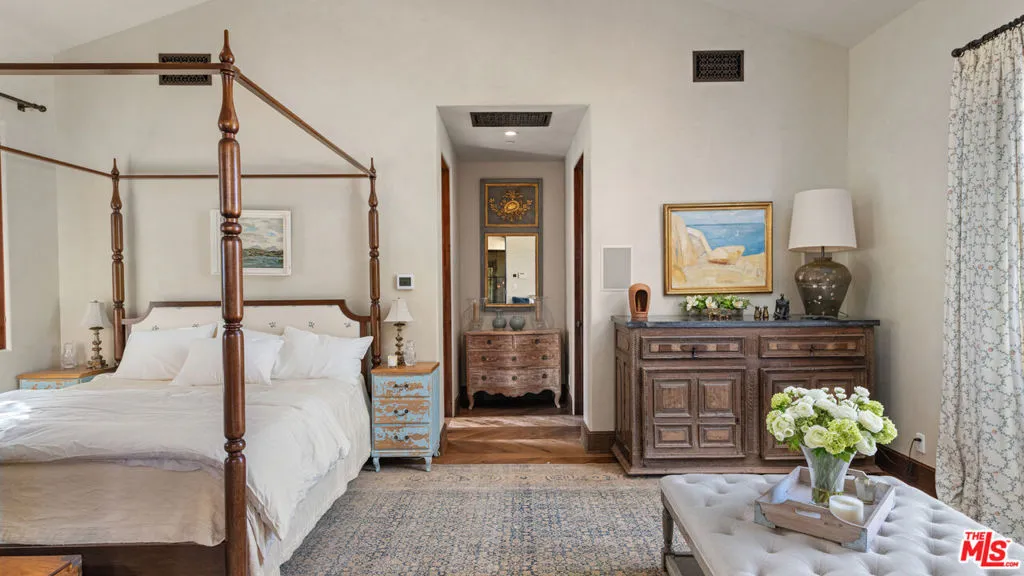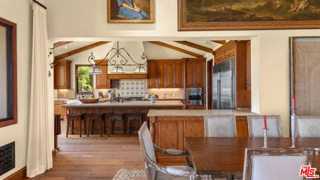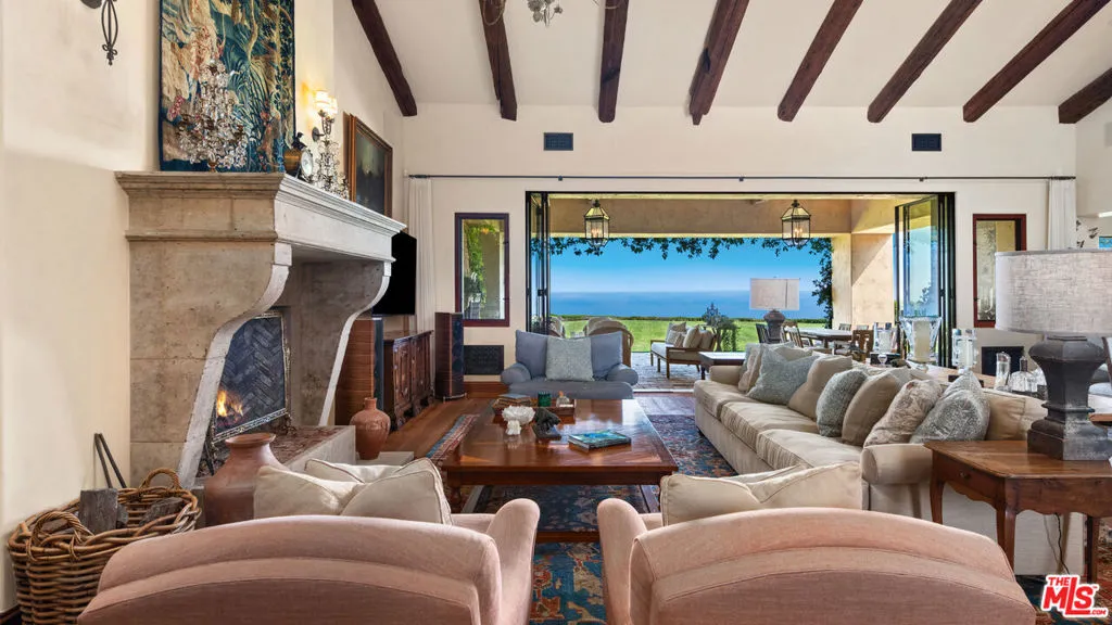 Tucked away behind gates atop the Malibu hills, this enchanting estate captures panoramic ocean and mountain views while evoking the timeless romance of a European countryside retreat. The approach unfolds along a long drive into a broad motor court with parking for 10+ cars, framed by lush gardens and anchored by a stone fountain.Inside, soaring wood-beamed ceilings, French doors, and gallery walls create a backdrop of warmth and elegance. The main living room is crowned by a monumental fireplace and flows to a formal dining room and chef’s kitchen, where custom cabinetry, a walk-in pantry, dual ovens, a Viking range, Wolf six-burner cooktop, and a large stone-topped island cater to both intimate evenings and grand entertaining. Nearly every room opens to patios, gardens, or terraces, merging the indoors with the property’s dramatic natural setting.The estate is designed with multiple wings for privacy. The primary suite features vaulted ceilings, a stone fireplace, and walls of glass that frame ocean and pool views. Its spa-inspired bath offers dual vanities, a soaking tub, and a large shower with multiple heads. Additional bedroom suites include private patios and marble-clad bathrooms, while a powder room delights with hand-painted lemon grove murals and a sculptural wood vanity. Beyond the main house, a detached office with vaulted ceilings, stone fireplace, reclaimed wood built-ins, and a wet bar creates the perfect studio or guest space. Across the court, a guest suite adjoins the garages, complete with wood floors, vaulted ceilings, en-suite bath, and French doors to a pergola-shaded patio. The outdoor living is extraordinary: a covered loggia with stone fireplace, alfresco dining, and heaters for year-round enjoyment; expansive lawns flowing to a long rectangular pool and spa with automatic cover; and terraced gardens with citrus groves, fountains, koi ponds, and box hedges. Meandering stone paths lead to a barn-inspired guest structure with a porch swing and firepit seating, all overlooking breathtaking ocean and canyon vistas. A professional-grade recording studio with soaring ceilings, custom acoustics, and a sound room enhances the estate’s versatility, offering creative refuge for artists and visionaries. Throughout the property, hidden seating areas, romantic pergolas, and layered gardens create a sense of discovery and retreat. Exquisitely landscaped and thoughtfully designed, 2900 Corral Canyon Rd is a rare Malibu estate that combines European elegance, coastal serenity, and boundless possibilities for living, entertaining, and creating.
