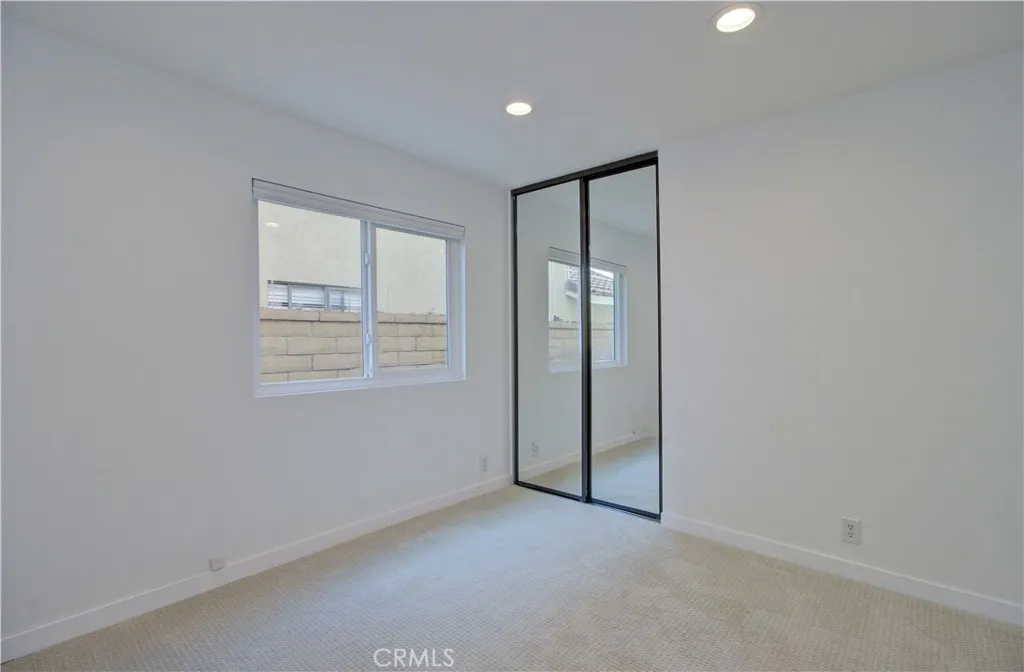 The primary suite includes two closets with mirrored doors and a private en-suite bathroom. Three additional bedrooms feature brand-new carpet and recessed lighting. Updated vinyl windows are found throughout the home, enhancing both comfort and efficiency. The washer and dryer are conveniently located inside the home within a dedicated closet area.