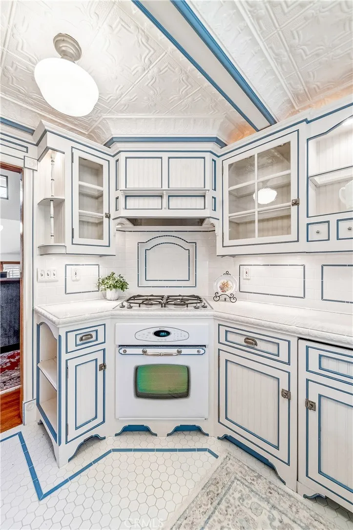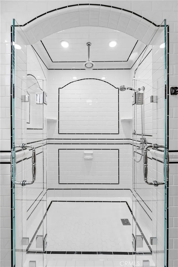 This enchanting location provides the perfect backdrop for the home’s extraordinary craftsmanship. Inside, the home unfolds with dramatic volume ceilings, exposed wood beams, clerestory windows, and exquisite custom millwork throughout. Rich hickory floors ground the space, while architectural archways and thoughtfully framed openings create a sense of beauty and permanence. A stunning mezzanine gallery overlooks the great room, featuring floor-to-ceiling bookshelves and a striking stained-glass window crowning the space, a perfect lounge, library, or retreat. The kitchen and bathrooms showcase custom cabinetry, glass-front uppers, and finely detailed tilework composed of the smallest, most precise pieces, thoughtfully chosen finishes, a testament to craftsmanship rarely seen today.