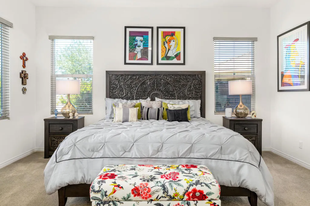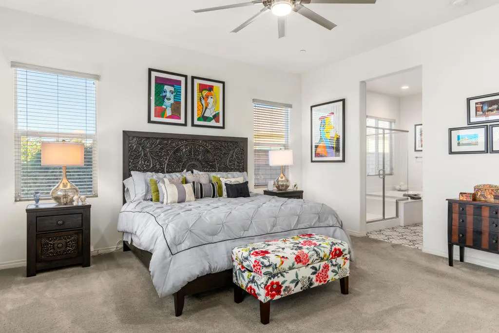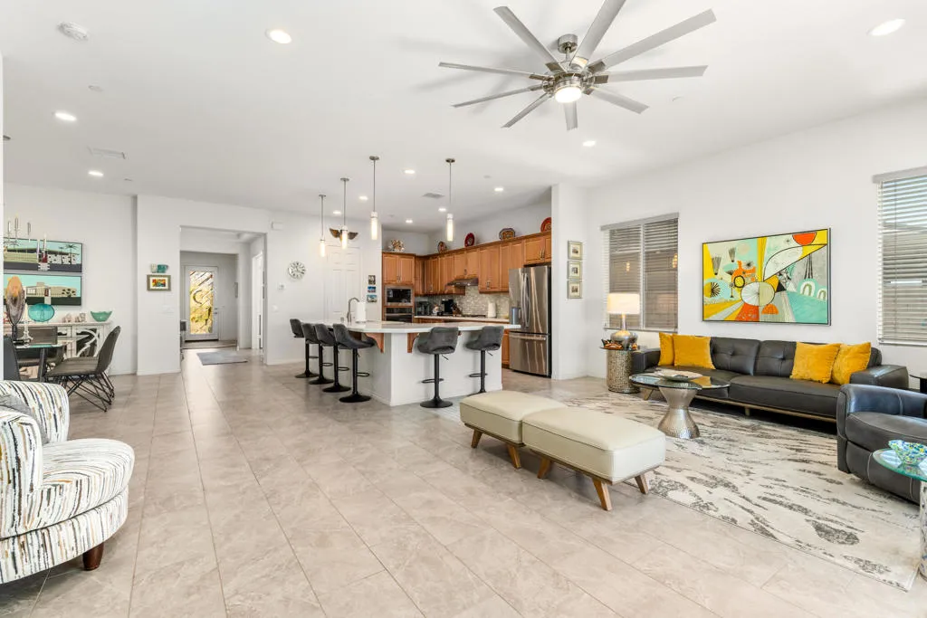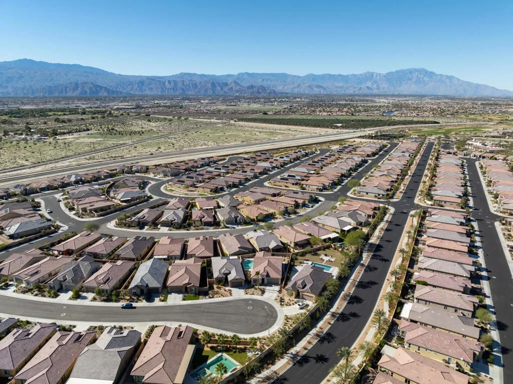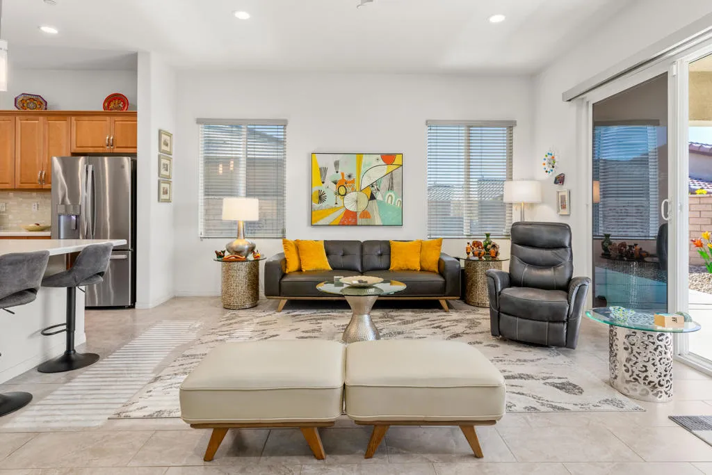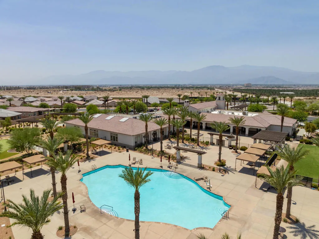 Welcome to this gorgeous Mecca Hills floor plan, showcasing true model-home appeal. Built in 2021 and enhanced with $85,000 in upgrades, this stunning residence offers a spacious open-concept design featuring 2 bedrooms, 3 bathrooms, and a versatile den. The heart of the home is the show-stopping kitchen, boasting chef-inspired appliances, a double oven, generous pantry, designer backsplash, and an oversized quartz island with bar seating and elegant pendant lighting–perfect for both everyday living and entertaining.The living room is highlighted by dramatic 16-foot double sliding glass doors complemented by sleek electric shades, filling the space with natural light while maintaining privacy and comfort. Throughout the home, 10-foot ceilings, recessed lighting, Italian porcelain tile flooring, and custom ceiling fans create a refined and modern ambiance. Smart features include an app-controlled thermostat and wireless alarm system for effortless convenience.The primary suite offers a peaceful retreat with a walk-in closet, oversized shower, and separate soaking tub, while the second bedroom features its own private ensuite bath. A large laundry room provides abundant cabinetry and storage. Step outside to your private backyard oasis featuring a newly built heated PebbleTec(r) pool and spa, with heating and lighting conveniently controlled by an app–ideal for year-round enjoyment.Located within the gated community of Four Seasons at Terra Lago, this home offers more than just beautiful living–it delivers a true resort-style lifestyle. Residents enjoy a 22,000-square-foot state-of-the-art clubhouse featuring a fitness center, ballroom, salon, massage room, indoor lap pool, and outdoor pool with cabanas. Additional amenities include tennis courts, pickleball, basketball, bocce ball, and a vibrant calendar of clubs and social events. 36 hole Championship golf next door, shopping, dining, casino’s all within minutes. This is luxury living at its finest.