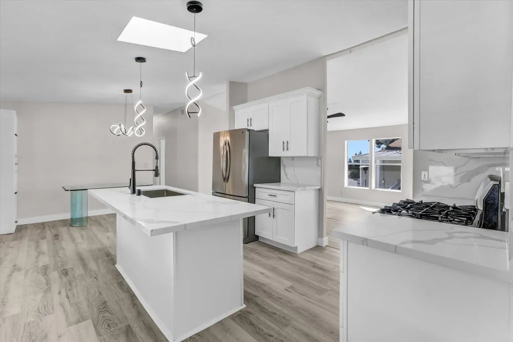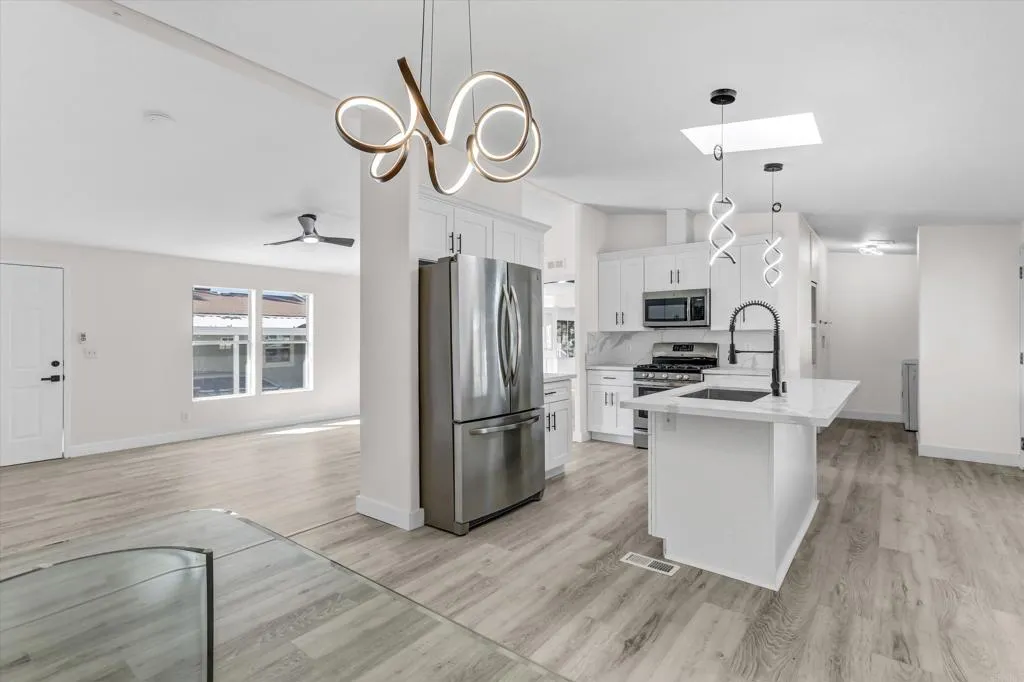 Fully remodeled 4 bedroom, 2 bath home in the highly desirable Rancho Valley Mobile home community, an all ages park in El Cajon. This 1,493 sq ft residence offers an open concept layout designed for comfortable everyday living and effortless entertaining. The modern kitchen features stainless steel appliances, timeless shaker style cabinets and a spacious island that flows seamlessly into the main living area. Bathrooms showcase sleek upgrades with clean, contemporary finishes and neutral tones. A bright sunroom provides valuable bonus space perfect for an office, playroom, or lounge area. Additional highlights include central AC, covered carport parking, private patio space ideal for relaxing or hosting guest, and a storage shed for added storage. Rancho Valley offers multiple amenities, including a community pool, spa, BBQ area, clubhouse with full kitchen, game room with billiards, library, and shuffleboard. Pet friendly community. Space rent is $1,875 per month. Ideally situated near restaurants and shopping centers, and close proximity to freeway access.