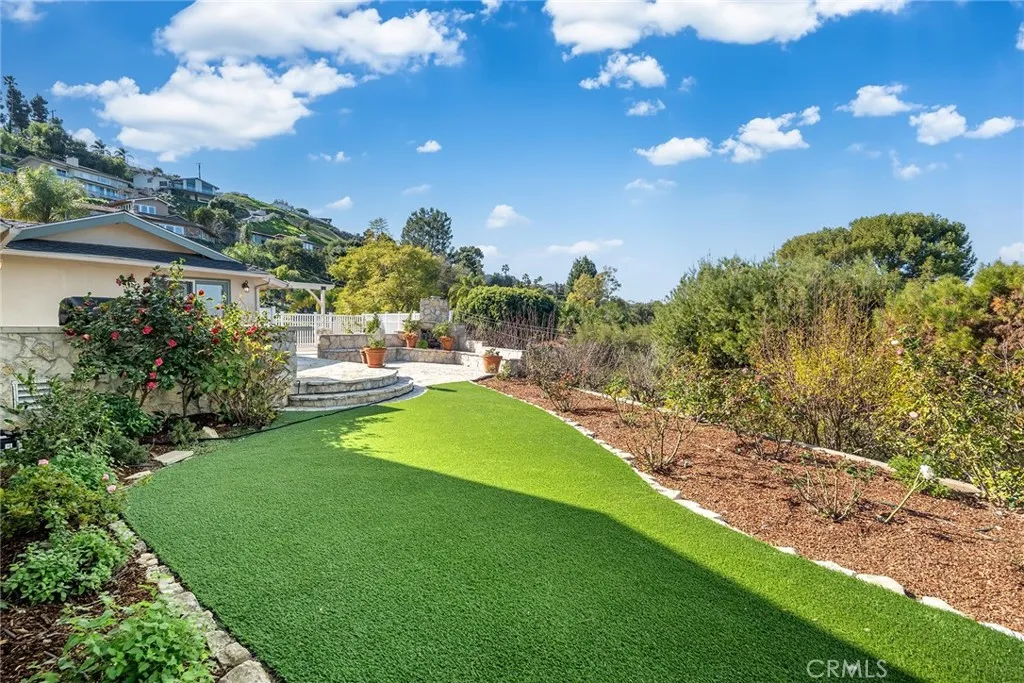 Gorgeous 4-bedroom, 3-bath home set on nearly half an acre, showcasing sparkling city lights and mountain views. Designed around an open-concept great room, the layout flows seamlessly between the kitchen, dining area, family room with fireplace, wet bar, and recreation space — all opening to inviting outdoor living areas. The backyard is ideal for entertaining, featuring a spacious patio with a built-in barbecue and stainless storage, outdoor fireplace, fire pit, and multiple gathering areas. The well-proportioned primary suite offers a marble-accented bath and a highly functional walk-in closet. A dedicated office with custom built-ins provides an excellent work-from-home setup, all bedrooms are generously sized. Wide-plank hardwood flooring runs throughout the home, complemented by abundant storage, including a stand-up attic area. The finished two-car garage features epoxy flooring for a clean, polished look. The expansive grounds include a large lawn, paver sport court, and a relaxing jacuzzi — the perfect spot to unwind while taking in the city lights.