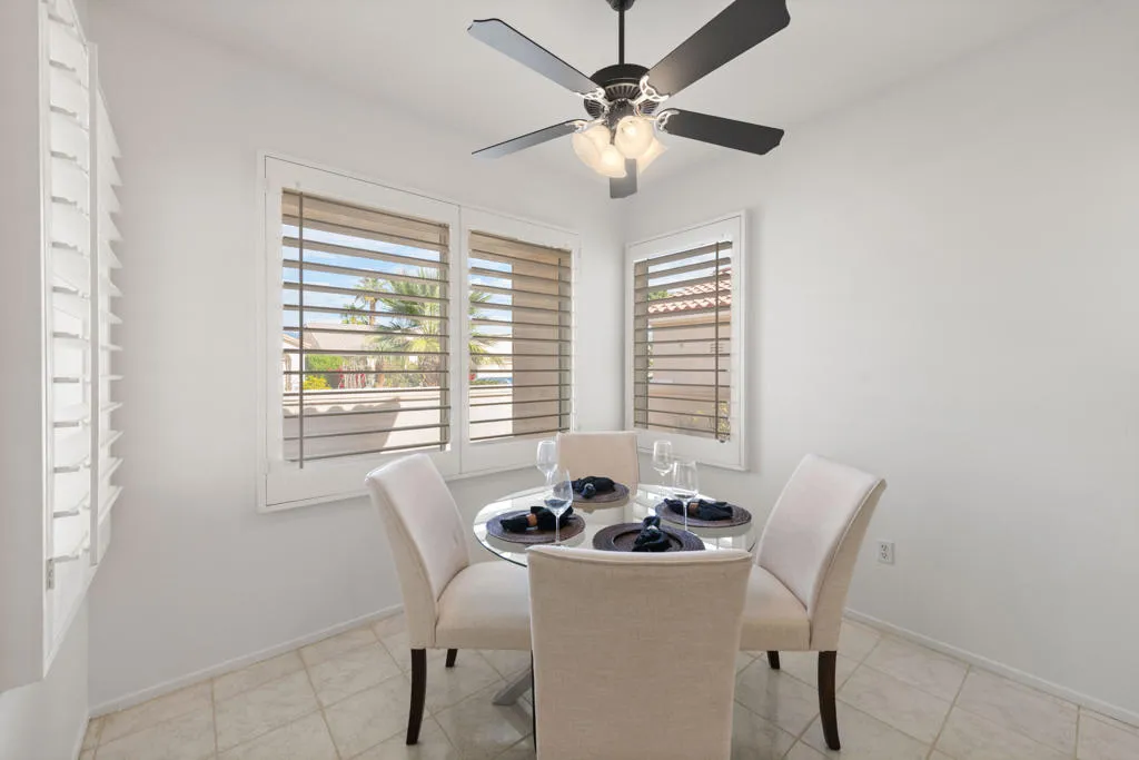 Sun City Palm Desert popular great room Montego floor plan shows pride of ownership and has been meticulously maintained. Most Desirable south facing backyard with 1858 sq.Ft. of living space, 2 bedrooms, 2 full baths, plus den or convertible bedroom. Kitchen is spacious with an eating area, upgraded kitchen cabinets, pull out shelves, brushed nickel pulls and desk and matching black appliances. Separate laundry room & 2 car attached garage is fully lined with storage cabinets. The extended primary suite has a French door leading to patio, a step-in shower, double cultured marble vanity and large walk-in closet . The guest bedroom & full bathroom are on the opposite side of the home for privacy. This home has a lot to offer with fresh paint and plantation shutters through-out, custom lighting, lighted ceiling fans, beveled mirror wall, custom tile w/entry medallion design, custom carpet borders and separate dinning area. 2 car garage has Epoxy floors and lined with storage cabinets. Private gated courtyard, and all concrete walk-ways have epoxy, desert landscaping and Sedona rock water fall in rear yard, covered patio so you can enjoy evening dinners or morning coffee. Gated front courtyard. Come enjoy the the Sun City Lifestyle with many clubs and activities.