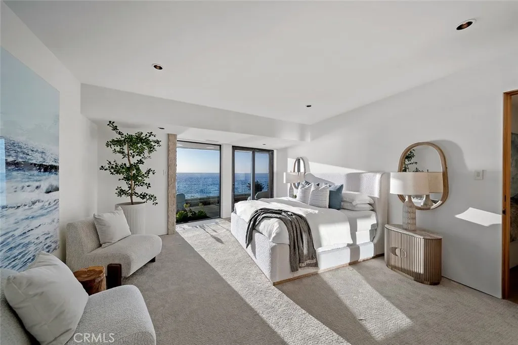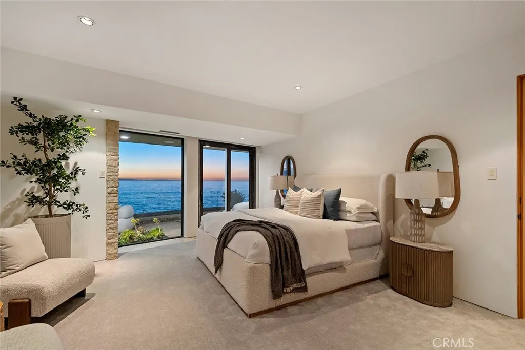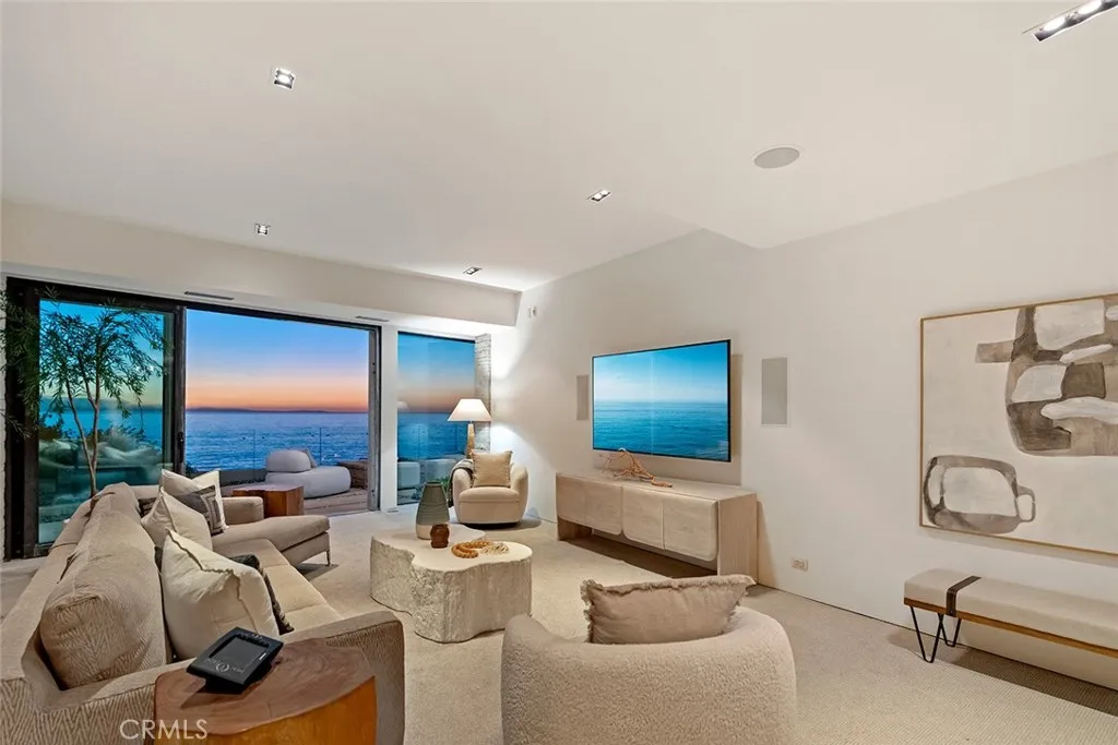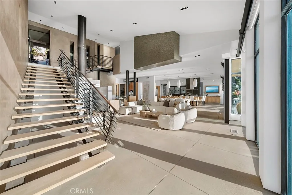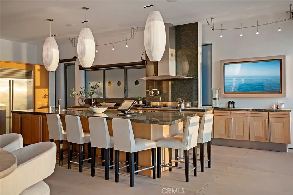 Beyond a private entry, a sculptural floating staircase leads to a dramatic double-height great room wrapped in walls of glass looking out to the sea. A statement fireplace anchors the space, with generous sitting and dining areas, a wet bar and a beautifully appointed chef’s kitchen with premium finishes. Special features include an oversized island which creates an effortless environment for entertaining. Sunlight fills the interiors, which open seamlessly to both a courtyard patio and an expansive ocean-view terrace. A versatile bedroom, currently styled as an office, completes this main level.