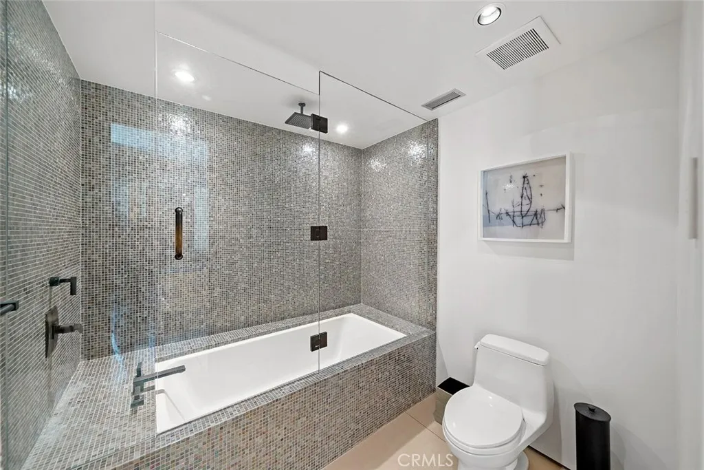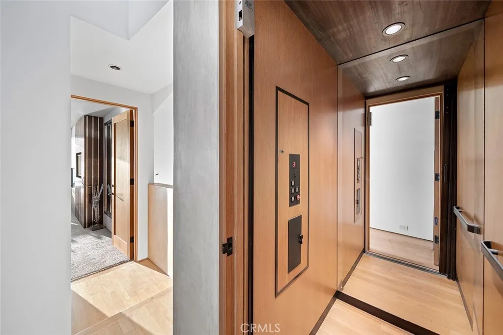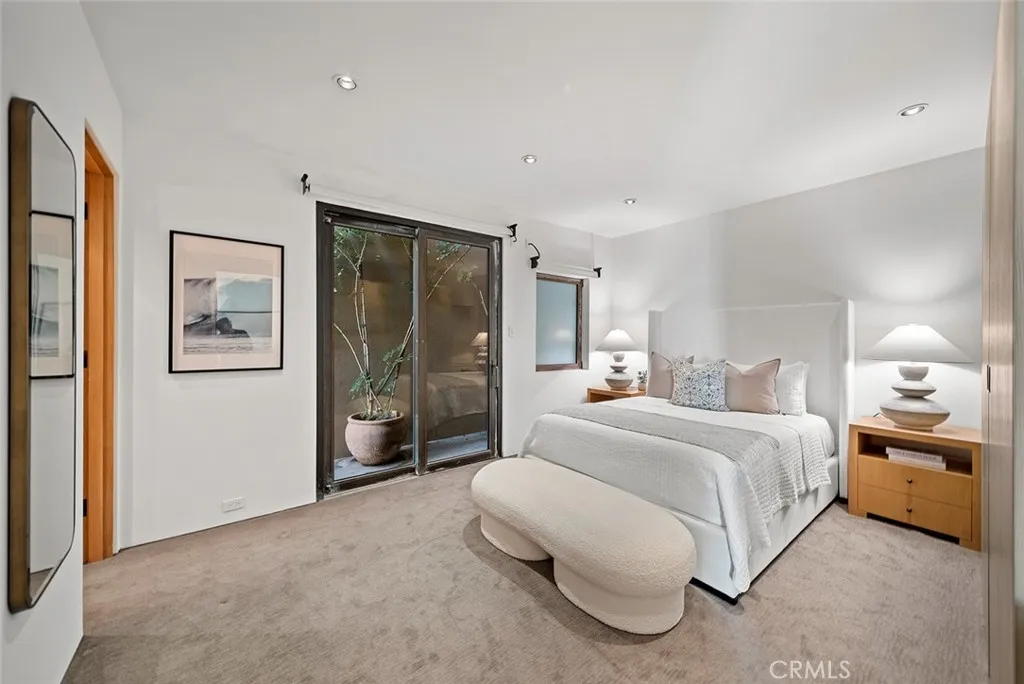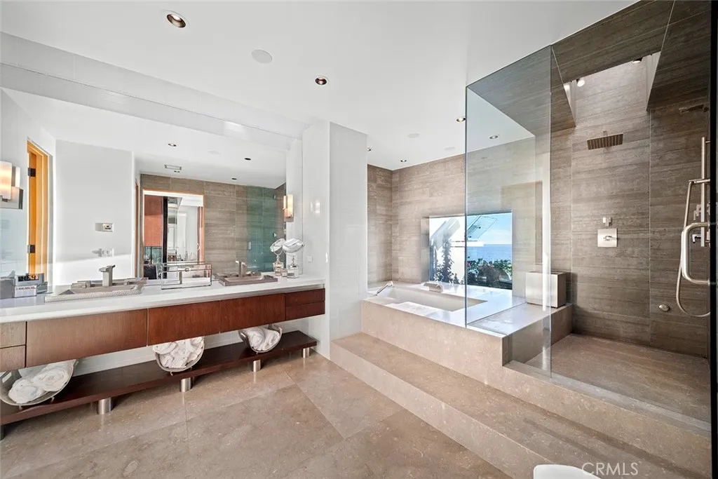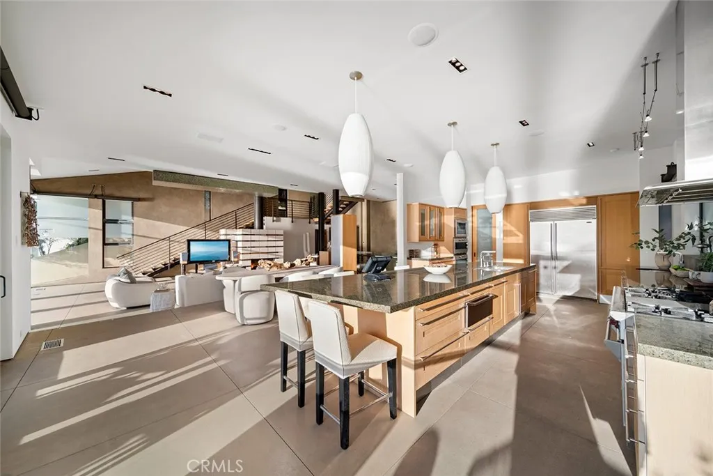 Beyond a private entry, a sculptural floating staircase leads to a dramatic double-height great room wrapped in walls of glass looking out to the sea. A statement fireplace anchors the space, with generous sitting and dining areas, a wet bar and a beautifully appointed chef’s kitchen with premium finishes. Special features include an oversized island which creates an effortless environment for entertaining. Sunlight fills the interiors, which open seamlessly to both a courtyard patio and an expansive ocean-view terrace. A versatile bedroom, currently styled as an office, completes this main level.
