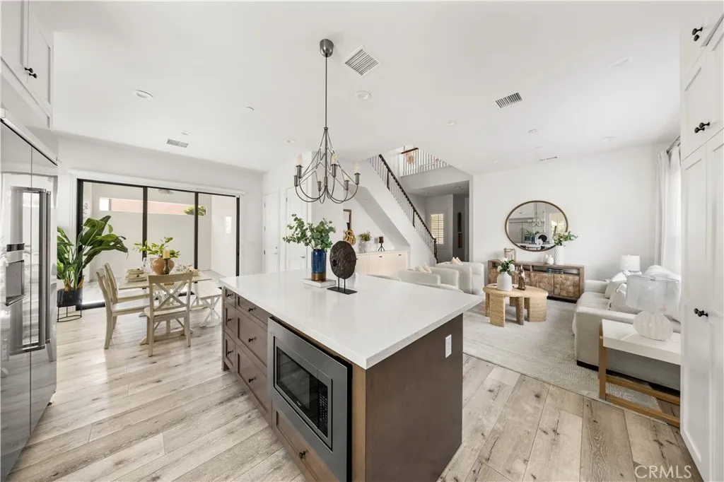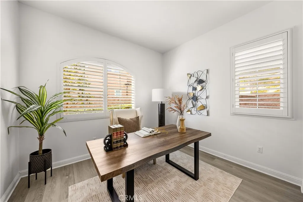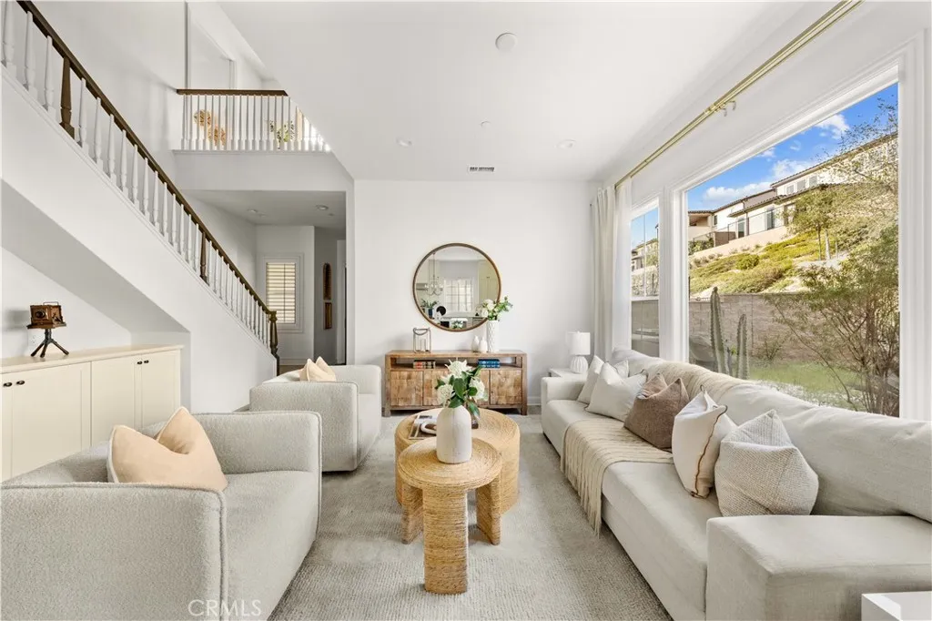 The home features an open floor plan with high ceilings. Upgraded sliding door systems create a seamless indoor-outdoor flow to the California room, overlooking a garden beautifully accented with desert landscaping and cactus plants, creating a calm and peaceful retreat. The home offers a convenient first-floor bedroom, with four additional bedrooms upstairs, providing a functional and well-designed layout. Additional highlights include a solar system and an electric vehicle charger.