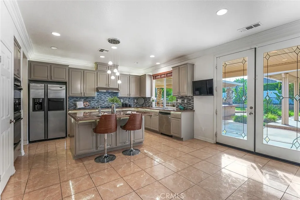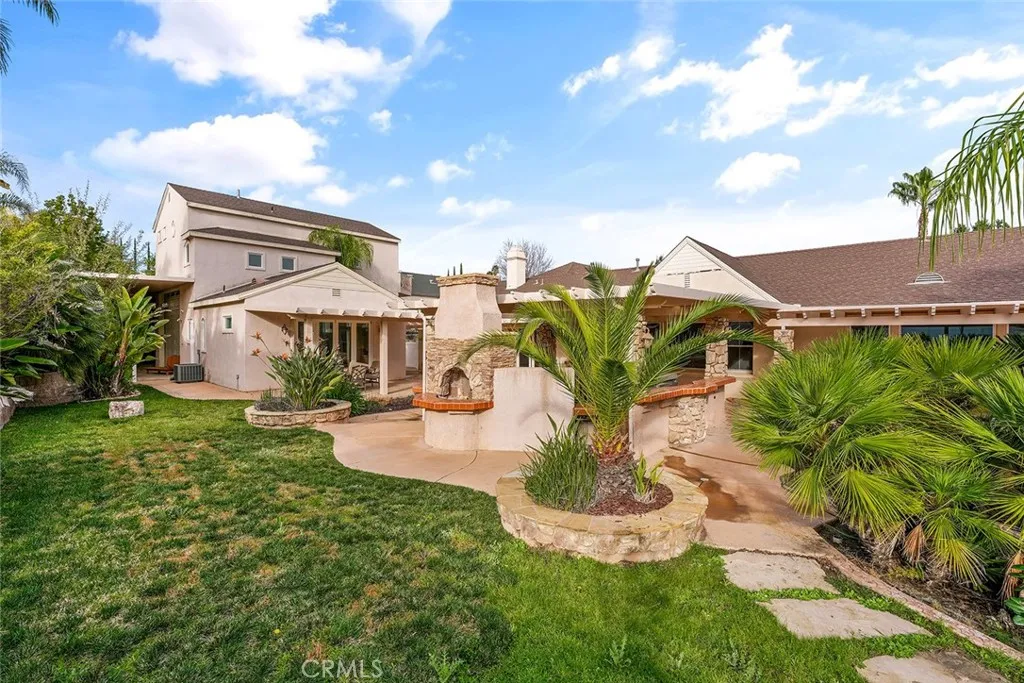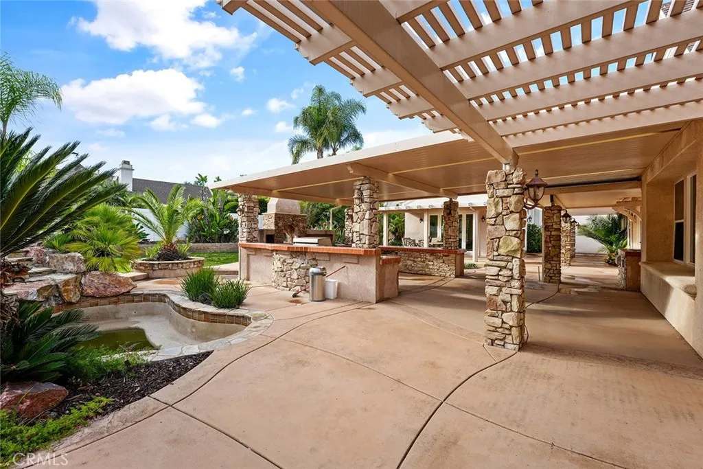 Enjoy a resort-style backyard with a covered patio, tropical landscaping, outdoor kitchen, and private spa—perfect for entertaining or relaxing in total comfort.