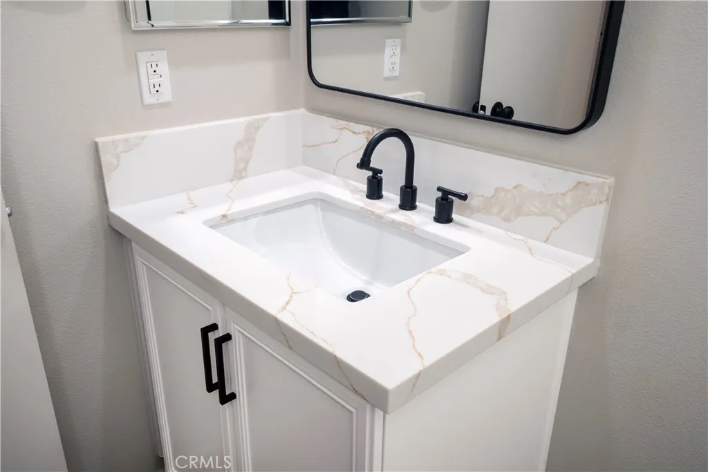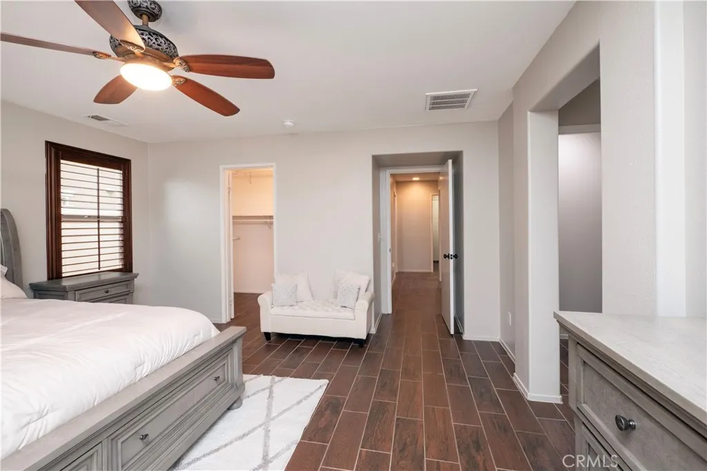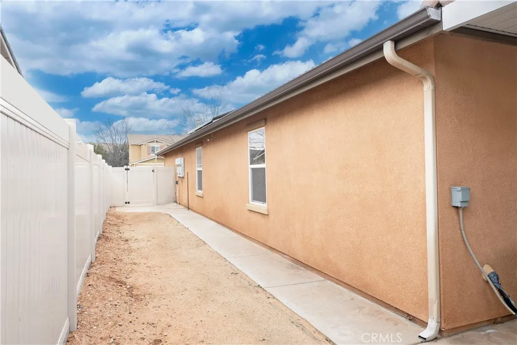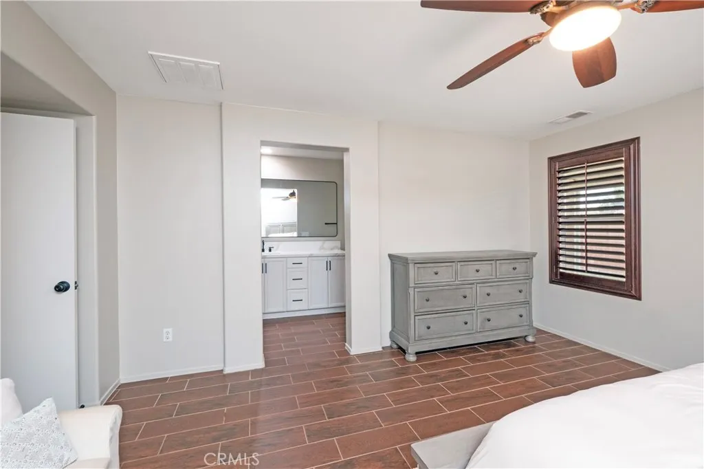 Wood-tile style flooring runs throughout, giving the home a clean, cohesive look that suits daily life. Fresh interior paint and window shutters throughout allow natural light to move easily through the space, keeping everything bright yet calm. In the kitchen, updated recessed lighting enhances the open floor plan and brings a warm, inviting feel. The kitchen sits at the heart of the home and has been thoughtfully refreshed with painted cabinetry, new hardware, quartz countertops, a classic subway tile backsplash, and new appliances. A 5-stage under-sink water filtration system adds everyday convenience, blending style with function. The primary ensuite has been updated with new shower doors, fixtures, and faucets, while new faucets in the secondary bathroom continue the refreshed feel throughout. Practical upgrades such as paid-off solar and a paid-off water softening system offer long-term value and peace of mind. Sliding doors open to a covered patio that spans the back of the home, creating an easy extension of the living space for outdoor dining or quiet evenings. The yard feels private and manageable, with citrus trees adding a subtle outdoor touch. Set on a cul-de-sac with a low HOA, the setting feels calm and established. Positioned between the mountains and the desert, the location keeps Big Bear, Palm Springs, and Los Angeles within convenient reach while still offering a more relaxed pace of life. Thoughtfully updated and well cared for, this home offers a comfortable lifestyle that feels ready to be enjoyed.