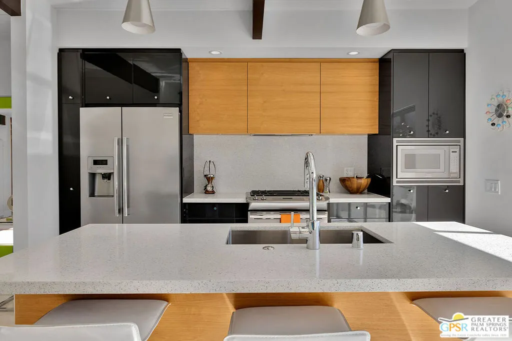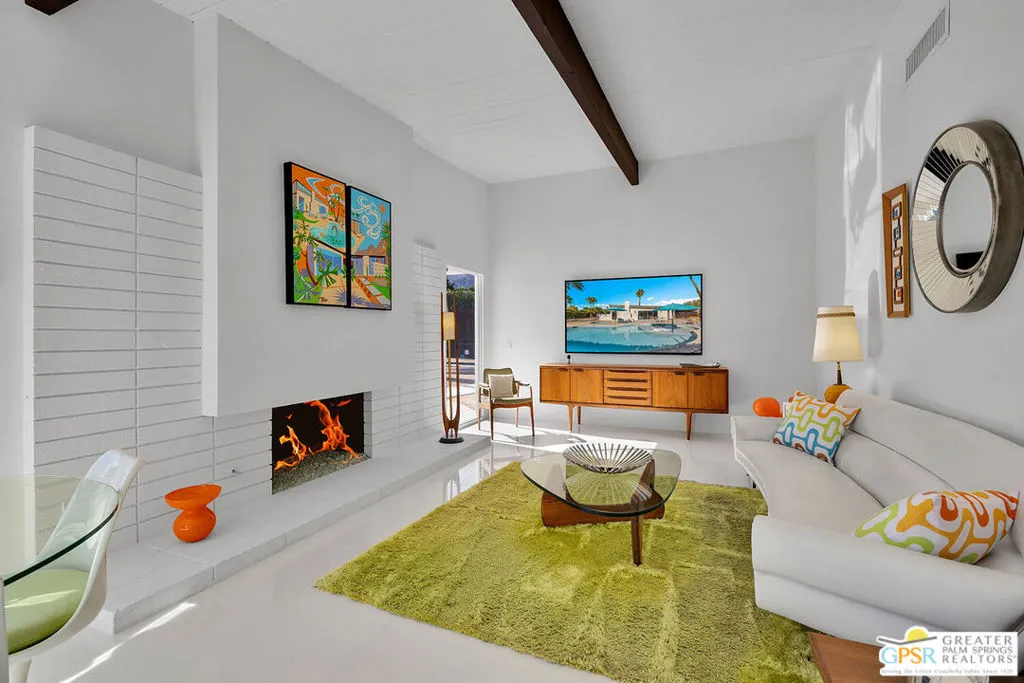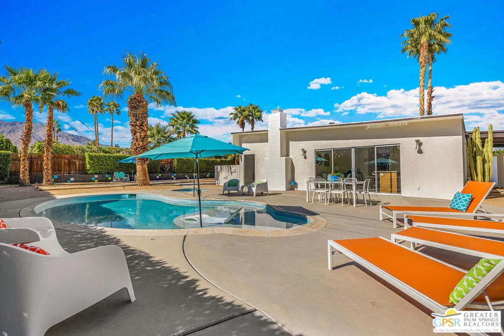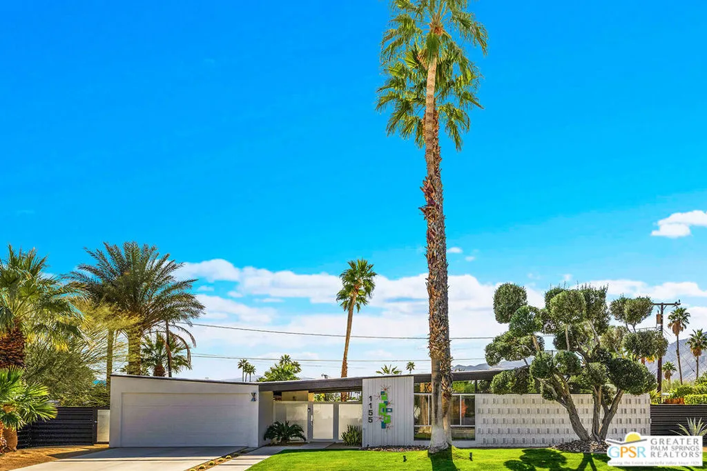 Believed to be one of the last Alexander-built butterfly roof homes constructed in Racquet Club Estates in 1962, this impeccably restored mid-century modern residence is a rare Palm Springs offering. Set on one of the largest lots in the neighborhood and enjoying coveted full southern exposure, the home delivers an exceptional modern desert lifestyle. Originally designed by Palmer & Krisel in the late 1950s, the iconic floor plan has been thoughtfully restored to honor its post-and-beam architecture, soaring clerestory windows, and clean modern lineswhile seamlessly adapting to today’s living standards. The residence offers three bedrooms and two spa-inspired baths, complemented by a sleek European-style kitchen with quartz countertops and stainless steel appliances. Polished white porcelain floors and a striking block wall fireplace complete the refined interior aesthetic. Outdoors, the property truly shines. A sprawling resort-style pool and in-ground spa anchor the expansive grounds, joined by a bocce ball court, gazebo with fire pit, and meticulously designed desert landscaping. Wraparound mountain views and effortless indoor-outdoor flow create a setting ideal for both everyday living and entertaining. Recent upgrades include a newly coated foam roof, updated plumbing, refreshed pool systems, an on-demand water heater, and dual-pane windows throughout. Rare, iconic, and impeccably maintained, this is a home that must be experienced in person to be fully appreciated. Contact the listing agent to arrange a private showing.