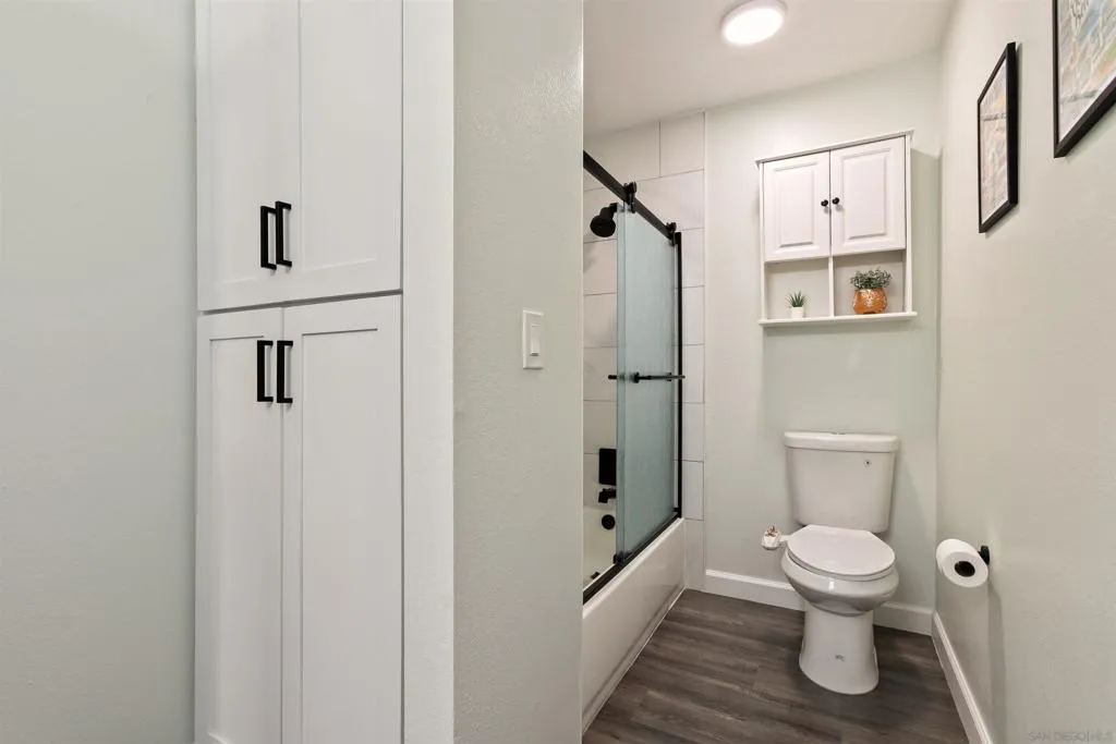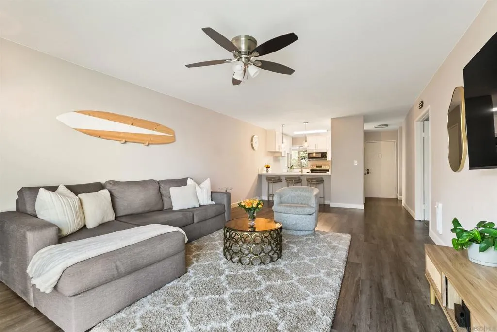Centrally located in the heart of Clairemont, this fully renovated top-floor 2-bedroom, 1-bath condo is move-in ready and located within a gated community. The home features new windows and updated finishes throughout, creating a bright, modern living space. The kitchen has been completely remodeled with durable quartz countertops, slim shaker cabinetry with sleek hardware, stainless steel appliances, and new pendant lighting, opening seamlessly to the main living area. Additional highlights include a beautifully updated bathroom with a dual-sink vanity, tiled shower, and bathtub, a walk-in closet, a full-size washer and dryer conveniently located inside the unit, an upgraded electrical panel, and a reverse osmosis water filtration system. Community amenities include a pool and spa, along with recent complex upgrades such as all-new roofs and rebuilt balconies. Ideally situated near shopping, dining, major freeways, beaches, downtown San Diego, the airport, and SeaWorld, this turnkey condo offers modern, low-maintenance urban living in a highly central location.
