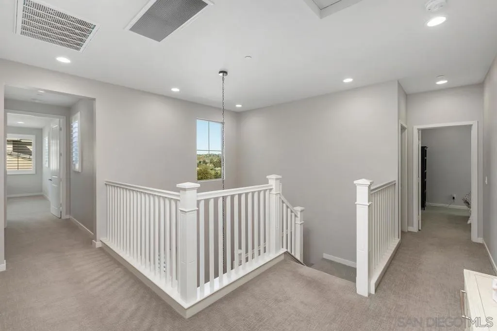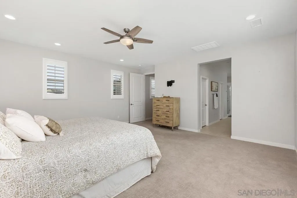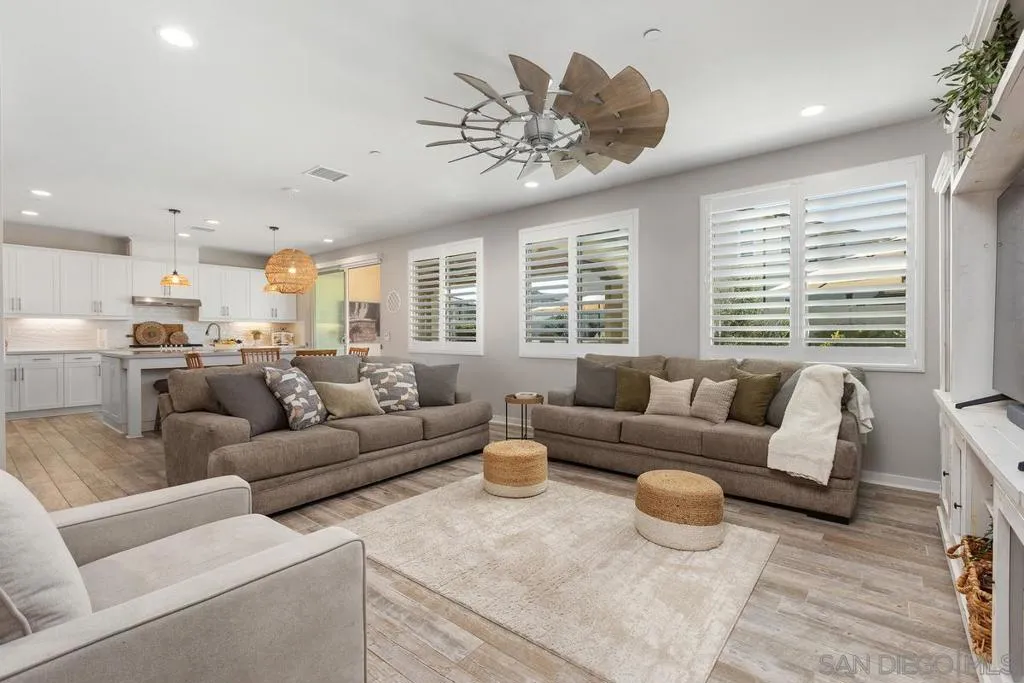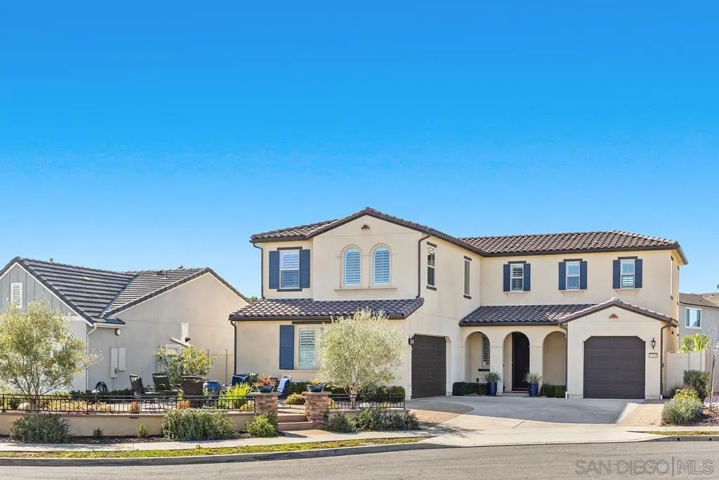 Nestled on a quiet cul-de-sac in the desirable SL Rey community, this beautifully designed 4-bedroom, 2.5-bath home blends contemporary sophistication with everyday functionality. The open-concept great room creates an inviting space for living and entertaining, while the chef’s kitchen impresses with quartz countertops, a large center island, custom white soft-close cabinetry, high-end stainless steel appliances, 5-burner gas vented range, and charming cappuccino station. Thoughtfully curated finishes include tile plank flooring and plantation shutters throughout. Upstairs, the serene primary suite features a spa-inspired bath w/dual vanities, walk-in shower, two separate wardrobe closets.Conveniently located within walking distance to Bonsall Elementary School and future Bonsall Community Park, with No Mello-Roos. Resort-style outdoor spaces shine with a front seating area and center fountain, plus a backyard retreat offering an above-ground spa and built-in BBQ island with umbrellas, storage, and refrigerator. Additional highlights include two separate attached finished garages with epoxy flooring and openers, Instant hot water heater and 10-Panel Owned solar system. Single-stall garage offers private entry to a home office or optional main-level bedroom. Smart-home features include video doorbell, Wi-Fi thermostat, smart entry lock, lighting control, and whole house fan.