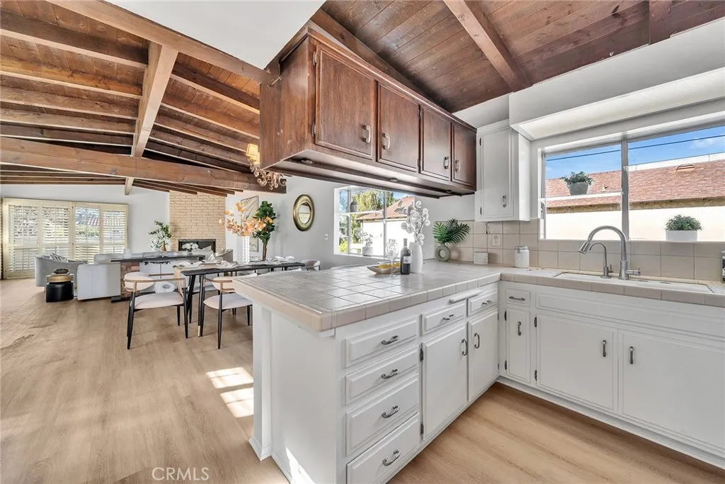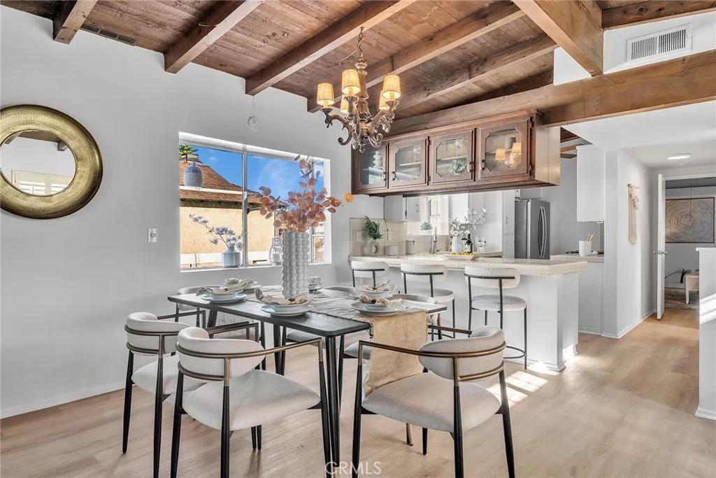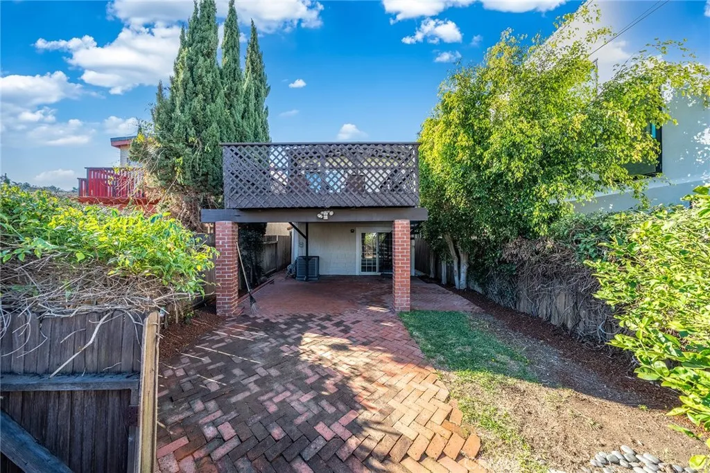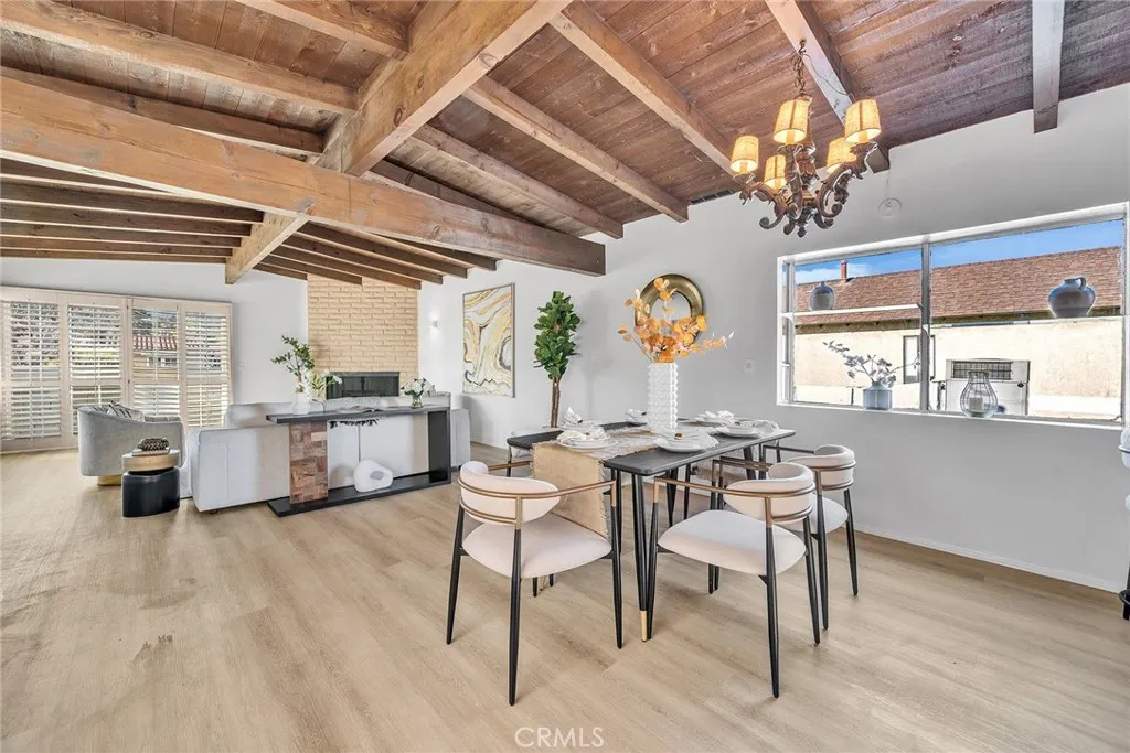 Upstairs, the home opens into a light-filled living space highlighted by dramatic wood beam ceilings, a cozy fireplace, plantation shutters, and a balcony overlooking the charming neighborhood. The adjacent dining area easily accommodates large gatherings, while the kitchen connects to a flexible nook that can serve as an office, play area, or creative workspace. The primary suite feels like a private retreat, featuring matching beamed ceilings and direct access to an expansive deck — an ideal setting for morning coffee, sunset dinners, or simply unwinding outdoors. A dual-access bathroom connects both the primary bedroom and living space for added functionality. Step outside and discover a backyard sanctuary filled with greenery, shaded lounging areas, and sunny open spaces. Stairs lead from the deck down to the yard, creating seamless indoor-outdoor flow perfect for entertaining or relaxing in your own private escape. Additional highlights include a direct-access two-car garage with driveway parking and location within the highly regarded Torrance school district. This home blends warmth, character, and lifestyle in one of Walteria’s most desirable neighborhoods — a place where everyday living feels just a little more special.