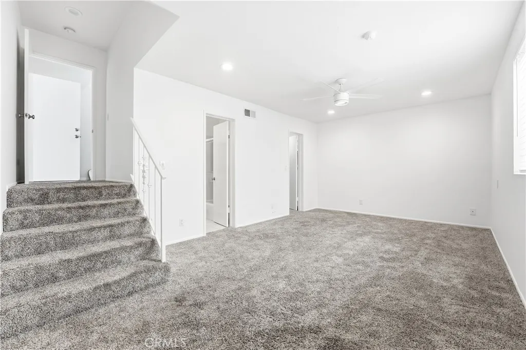 The second level serves as the main living area and includes two bedrooms with generous closet space and sliding glass doors that open to a private backyard patio. One of these bedrooms also features an en suite bathroom, offering an additional primary suite option.