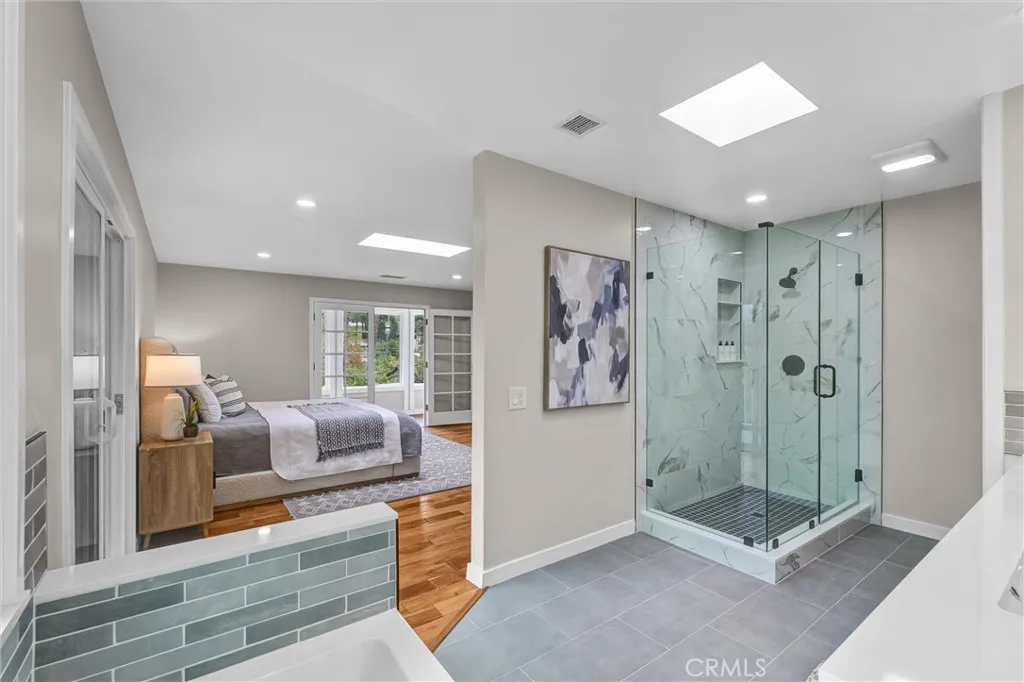 The private, top-floor primary suite is a true retreat with two balconies (one enclosed), a walk-in closet plus a secondary closet, and a fully remodeled bathroom with a soaking tub framed by mountain views and an oversized shower.