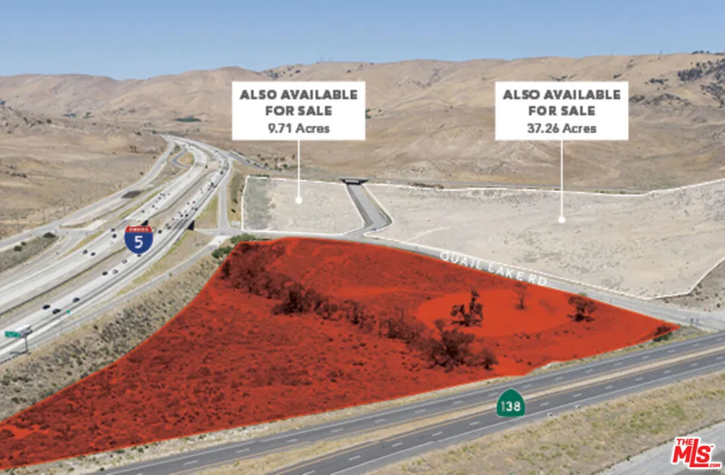 We are pleased to present a unique opportunity consisting of 13.21 acres on primarily flat commercial land along the 5 Freeway at the intersection of Highway 138. With 3 freeway off-ramps/on-ramps directly onto the property, the property, which has already paved roads, is well-positioned for a developer to take advantage of the 250,000+ vehicles per day traveling along one of the busiest freeways in the world that provides access to Los Angeles ports, Central Valley agricultural businesses, San Francisco tech hubs, and the entire West Coast. Ownership has a land use survey completed by David Evans and Associates, Inc. which can be made available for qualified buyers. Potential uses include hotels/motels, drive-through services, utility-scale solar energy, along with a myriad of other options, which the Buyer shall rely on their own due diligence and investigations to confirm in full. With nearby future developments including the fully entitled 12,000+ acre Centennial at Tejon Ranch Master Planned Community approximately3 miles away, which include 19,000+ homes and 10M+ square feet of retail/public/business park/office space/civic development, the next owner of these parcels may be well positioned for significant growth over the coming years. Also nearby is Pyramid Lake only 5 miles to the south, and the Tejon Ranch Commerce Center just 8 miles to the north. Seller financing available for qualified buyers! Contact the listing team today for additional information regarding this unique opportunity.