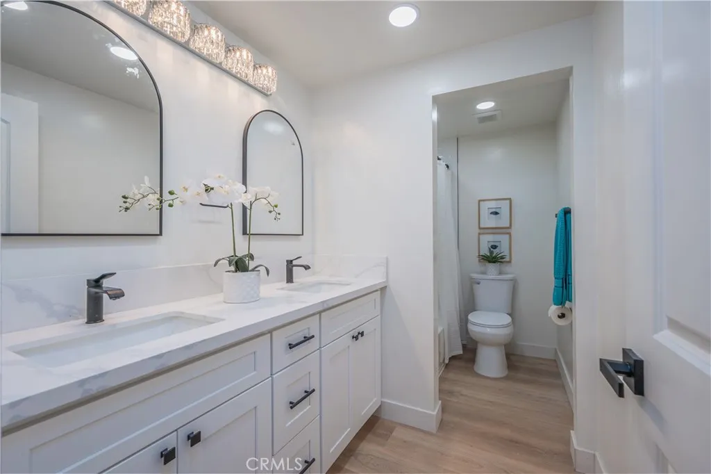 All three bathrooms have been completely remodeled with new vanities, granite countertops, updated toilets, mirrors, lighting, and flooring. The newly designed primary suite offers dual closets (one is a walk-in closet), new slider door, and a private ensuite bath featuring a beautifully upgraded shower and granite counters with double sinks.