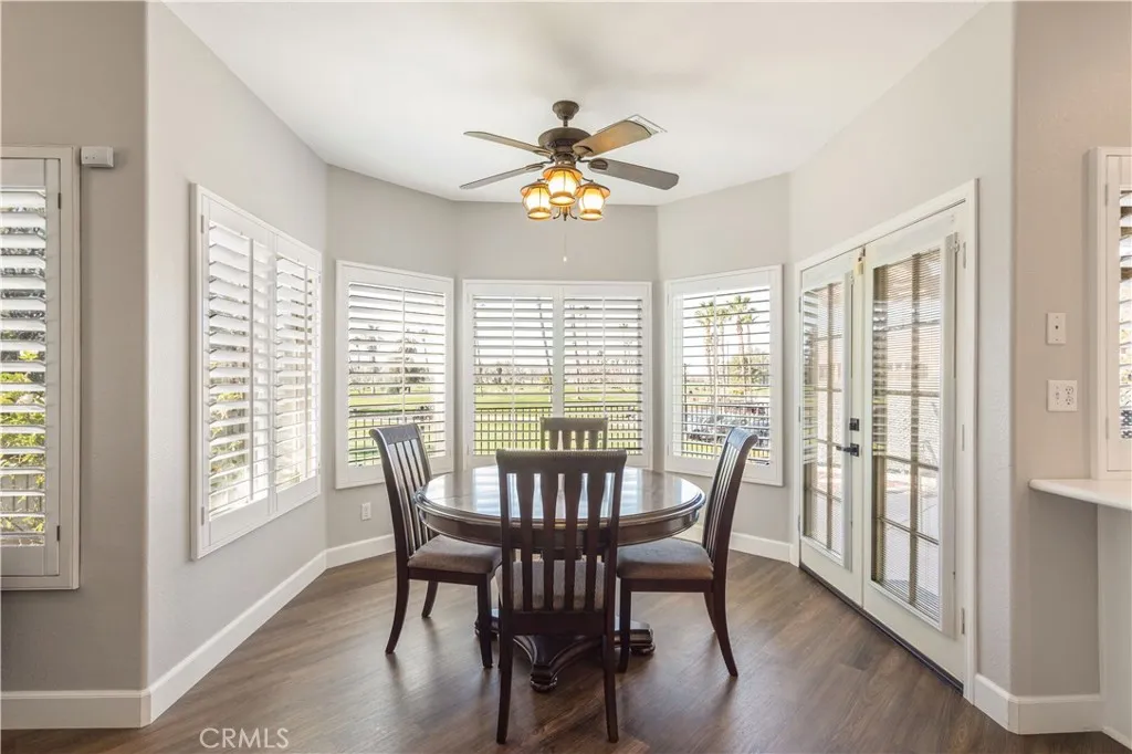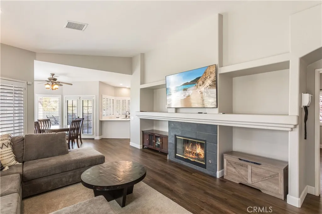 The home features three bedrooms, two bathrooms, and a patio overlooking the golf course—perfect for relaxing or entertaining. The bright, open floor plan is ideal for family living and includes a cozy gas fireplace in the family room. Additional highlights include new flooring, plantation shutters throughout, reverse osmosis water filtration, and air conditioning in the primary walk-in closet.