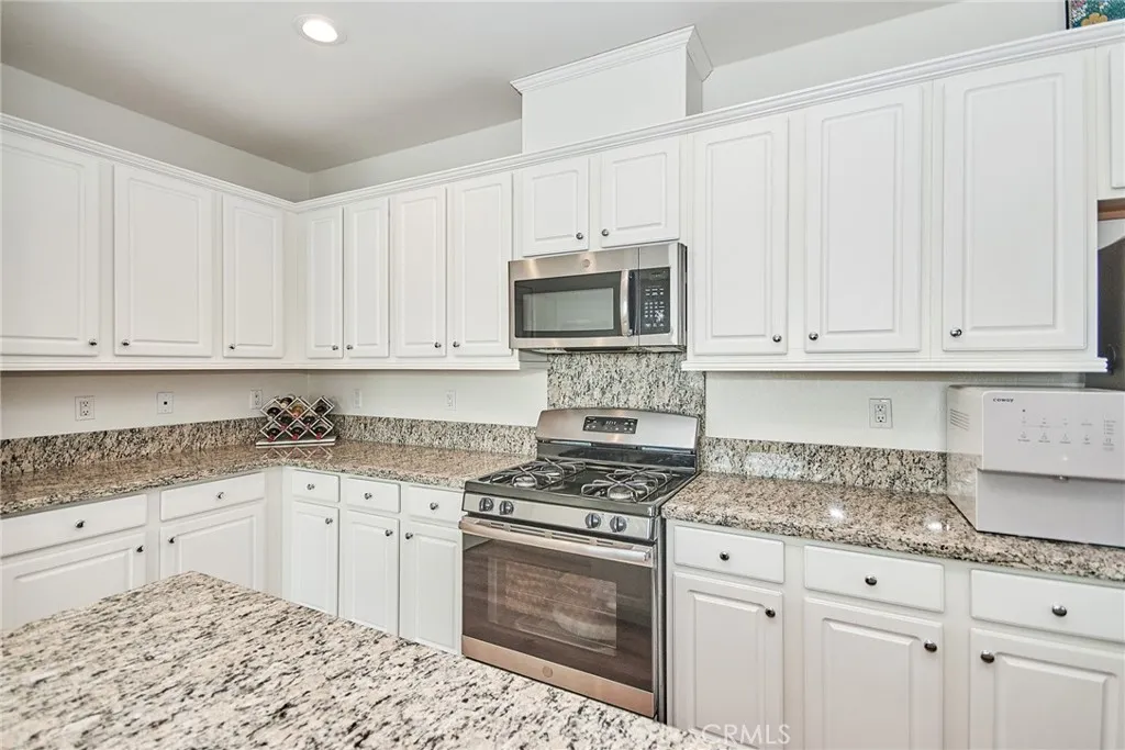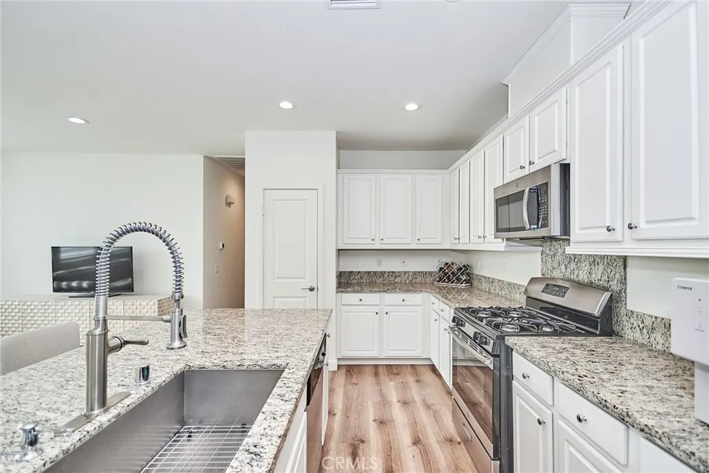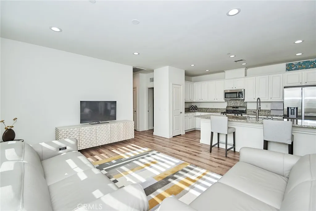 The gourmet kitchen is a true highlight, showcasing crisp white cabinetry, a center island, granite countertops, recessed lighting, stainless steel appliances, and a generous pantry, perfect for both everyday living and hosting guests.
