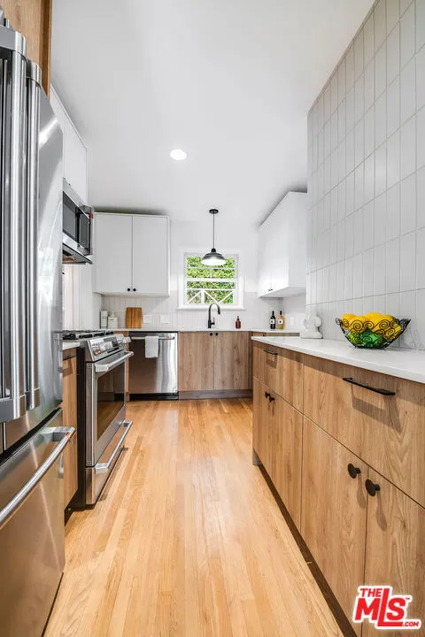 Set in the sought-after hills of Beachwood Canyon, 2446 Cheremoya Ave is a beautifully updated home that blends timeless character with thoughtful modern upgrades. Framed by mature landscaping and canyon greenery, this residence offers privacy, natural light, and a calm retreat just minutes from the heart of the city. Inside, refinished hardwood floors and an open, airy layout create an inviting flow throughout the home. The updated kitchen is both stylish and functional, featuring sleek cabinetry, high-end appliances, and a handcrafted Fireclay tile backsplash that adds a timeless, artisanal touch. Behind the scenes, updated plumbing and smart improvements bring peace of mind. The home offers two well-proportioned bedrooms along with a versatile bonus space ideal for a home office or creative studio. Comfort and convenience are elevated with smart home technology from Nest and Lutron, Hunter Douglas ceiling fans, and a custom California Closet system that maximizes storage without sacrificing design. Step outside to a multi-level landscaped yard designed for relaxation and entertaining, with inviting areas for dining, lounging, and enjoying the surrounding canyon setting. A detached two-car garage provides added functionality with EV charging and ample storage. Located near the Hollywood Sign, Beachwood Caf, scenic hiking trails, and Los Feliz dining and shopping, this home offers a rare balance of peaceful hillside living and easy urban access. An excellent opportunity to own a thoughtfully upgraded home in one of Los Angeles’ most iconic neighborhoods.