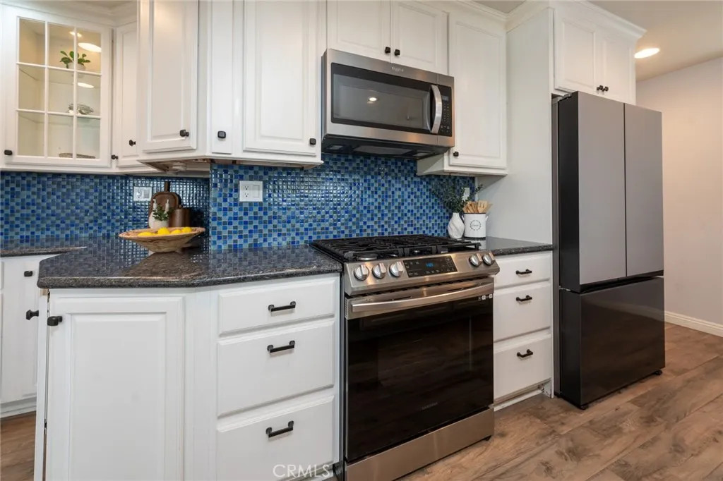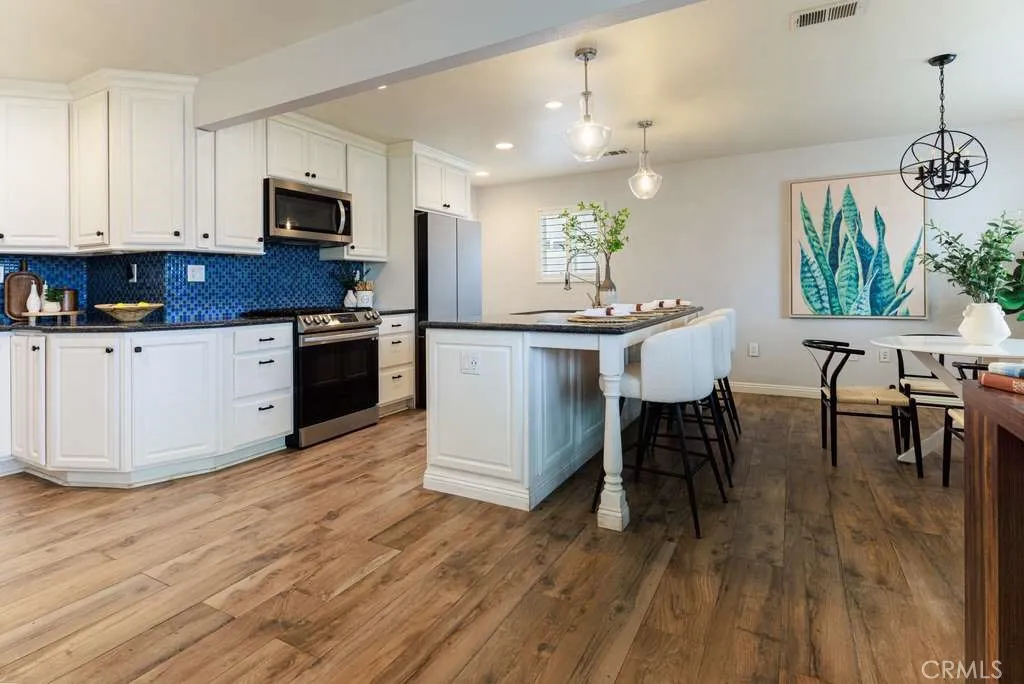 The kitchen offers white cabinetry, stainless steel appliances, granite countertops, abundant storage, and a large island with seating for four that flows seamlessly into the dining area.