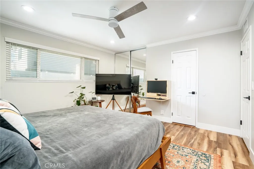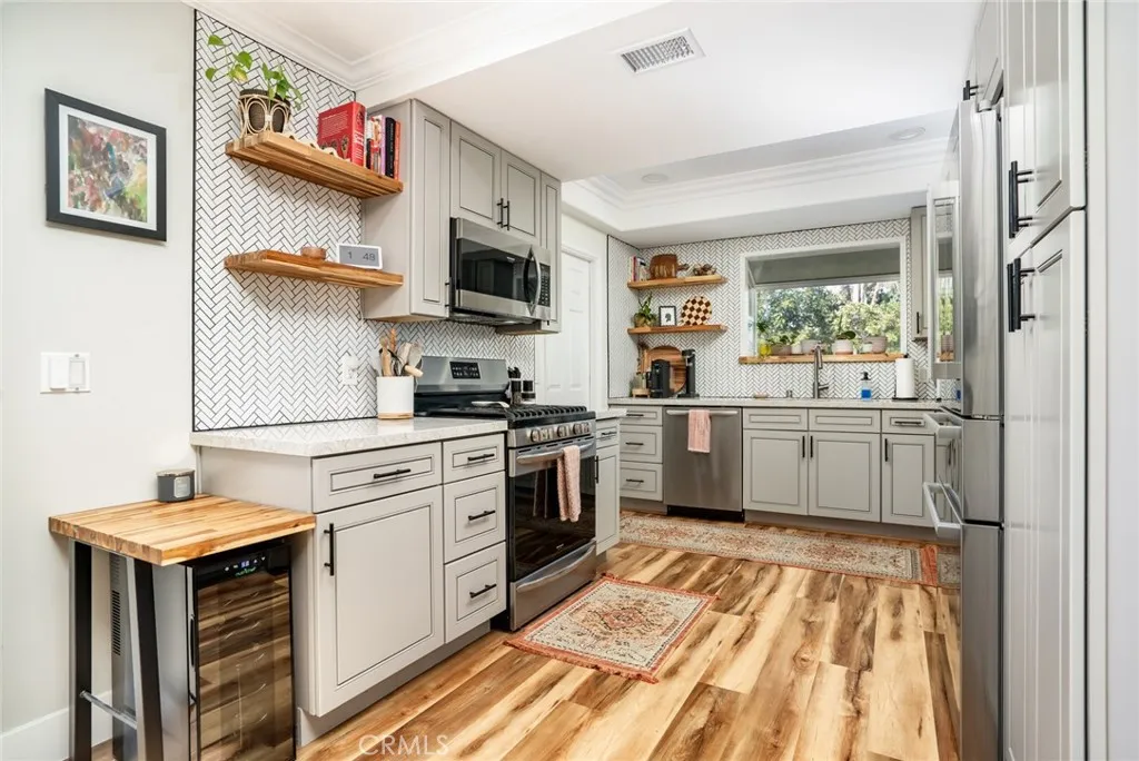 From the moment you arrive, the crisp architectural lines, fresh exterior finishes and thoughtfully designed no-maintenance drought-tolerant landscaping create standout curb appeal. A private front courtyard and custom entry set a warm, contemporary tone that carries throughout the home. Inside, the space feels clean, bright and effortlessly cohesive. Wide-plank waterproof flooring, fresh paint, modern finishes and ambient lighting create a calm, elevated atmosphere, while smart home features allow seamless control of lighting, climate, security, garage access and more. The remodeled kitchen blends style and function with quartz surfaces, updated cabinetry and open sightlines to the main living space, where a sleek Ice Glass fireplace adds a modern focal point. Custom storage solutions throughout reflect the home’s thoughtful design. The backyard is designed for everyday enjoyment and easy entertaining. Featuring a sparkling private pool, low to no-maintenance turf, drought-conscious landscaping and integrated lighting and sound create a private outdoor retreat that feels both relaxed and refined. Even the garage has been intentionally upgraded, offering a polished, highly functional space with custom built-in cabinetry, workspace flexibility, EV charging capability and valuable additional storage. Effortless smart home controls and a low to no-maintenance exterior allows you more time spent enjoying your home and less time working on it.