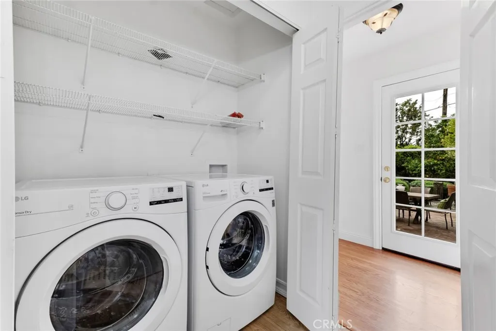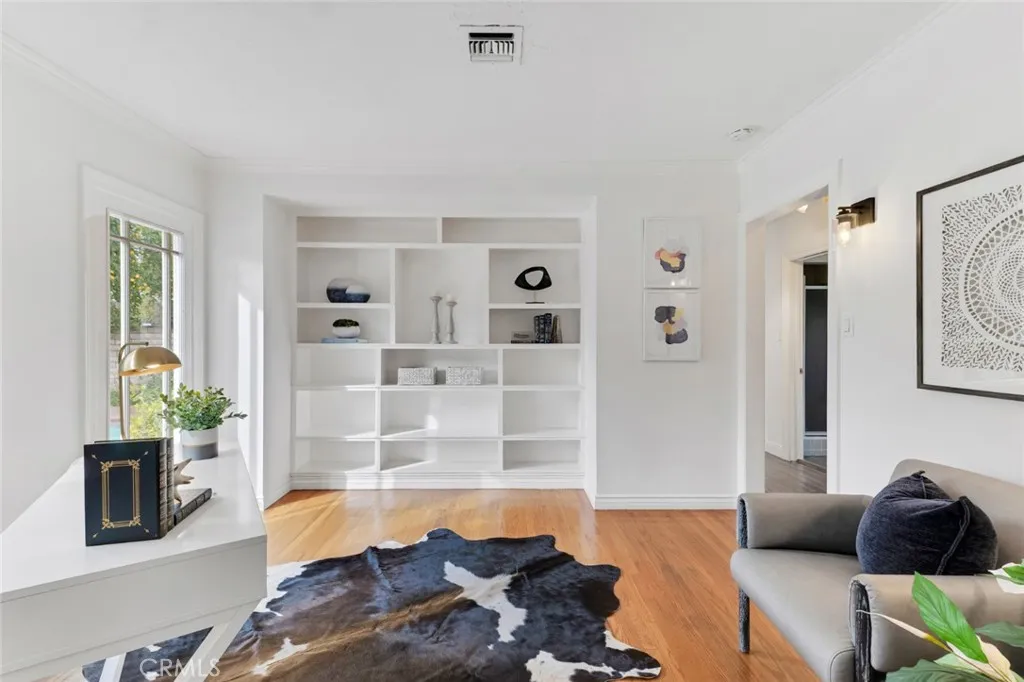Spacious and versatile 4 bed, 2 bath, ranch-style home on an expansive, privately gated 15,000+ sq ft lot in the coveted Sherwood Forest neighborhood of Northridge. Set back from the street, the fully-gated estate ensures privacy and offers wonderful outdoor space with a hexagon paver driveway framed by planters, decorative walkways and drought conscious landscaping offsetting a charming façade of wood siding, brick wainscoting, white trim and shutters for a timeless appeal. Inside, the home displays classic aesthetic touches like hardwood floors, crown molding and decorative wainscoting which blend beautifully with soaring vaulted ceilings and exposed beams in the living and dining rooms, anchored by a striking double-sided brick fireplace and custom built-ins that add warmth and architectural character. The vaulted kitchen is both functional and inviting, featuring a butcher block center island, oak cabinetry, decorative brick accent wall, a sunny greenhouse window and a cozy breakfast nook. French doors open to the back patio, enhancing indoor-outdoor flow. A spacious step-down addition with vaulted ceilings and French doors to the patio serves as a generous, private primary suite with luxury vinyl flooring, both a mirrored and walk-in closet with cedar paneling and floor, an en suite full bath with dual sink vanity, separate soaking tub and updated walk-in shower. The space can also serve as a home theater, rec room, gym, or private office, allowing exceptional versatility and functionality. Three additional large bedrooms on the other side of the house provide even more options, including a front room currently styled as an open den or office with built-in shelving that can easily convert back to a bedroom. The hall bath features tile floors, separate tub and shower and a bay window for added charm. Additional features include dual pane windows, a laundry closet with washer and dryer, and a two-car garage with storage. The park-like secluded backyard is designed for both relaxation and entertaining, with a herringbone brick patio and walkway, mature fruit trees (with eight kinds of citrus), a sparkling in-ground pool with brick coping, raised vegetable beds on the side yard for home gardening, and a storage shed. Wonderfully situated in the heart of Northridge, near shopping, dining, entertainment, recreation and the CSUN campus. Balancing openness, warmth and adaptability, this house presents an opportunity to create your perfect home.
