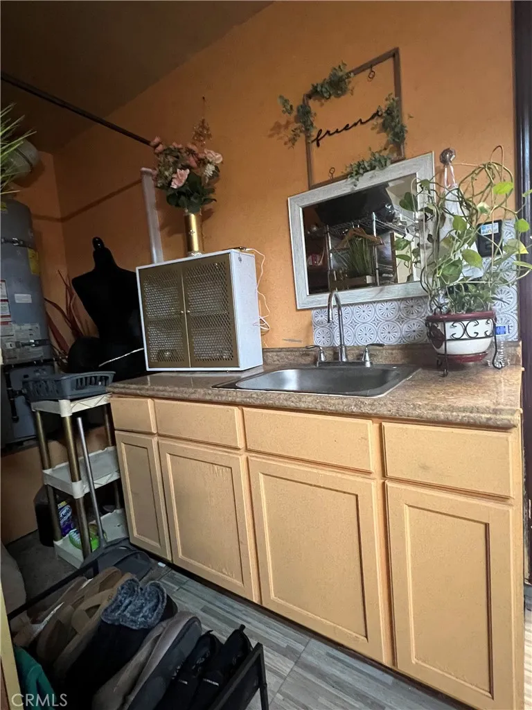 Sliding glass doors lead to a fully concrete backyard with a large freestanding storage shed. The fenced yard includes a metal side gate for easy access. The home also features a front sprinkler system with timer, rain gutters, dual-pane windows with blinds and screens, security cameras, smoke and carbon monoxide detectors, central electric air, and central gas heat.