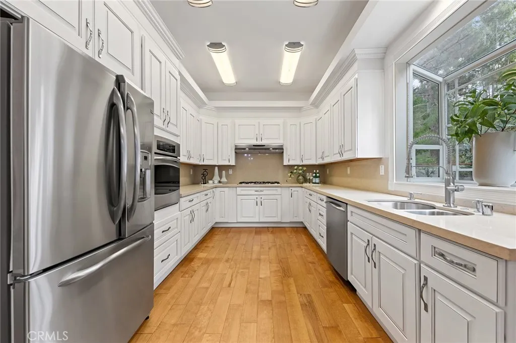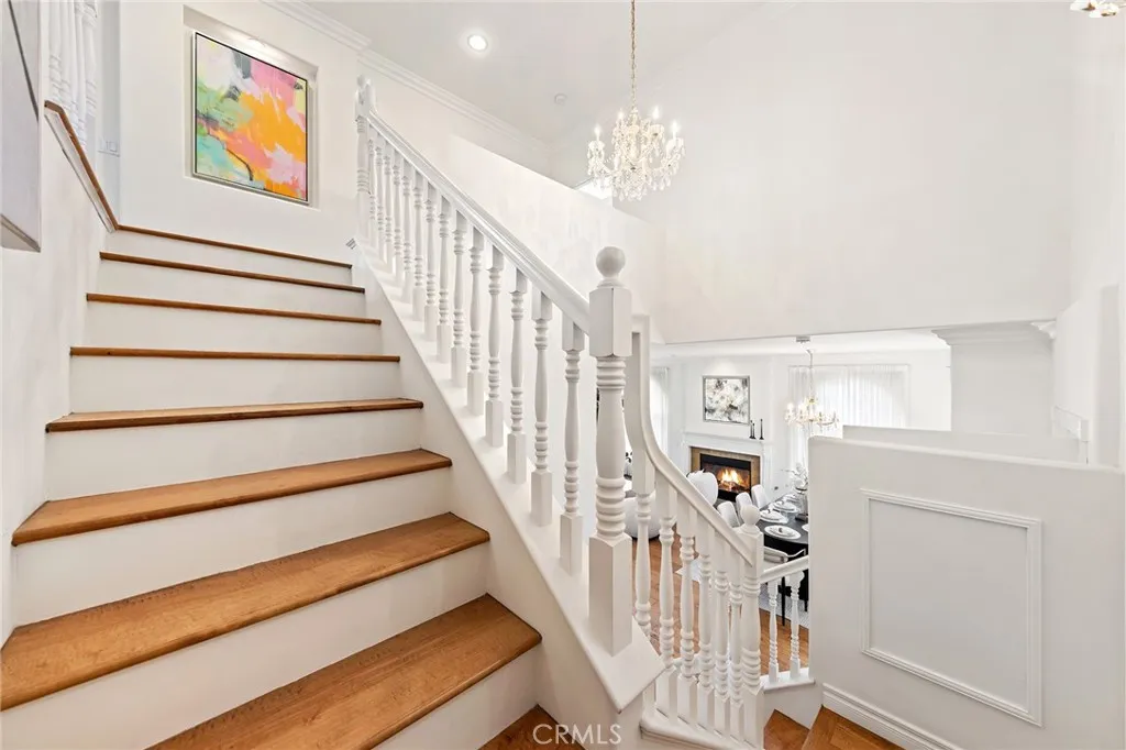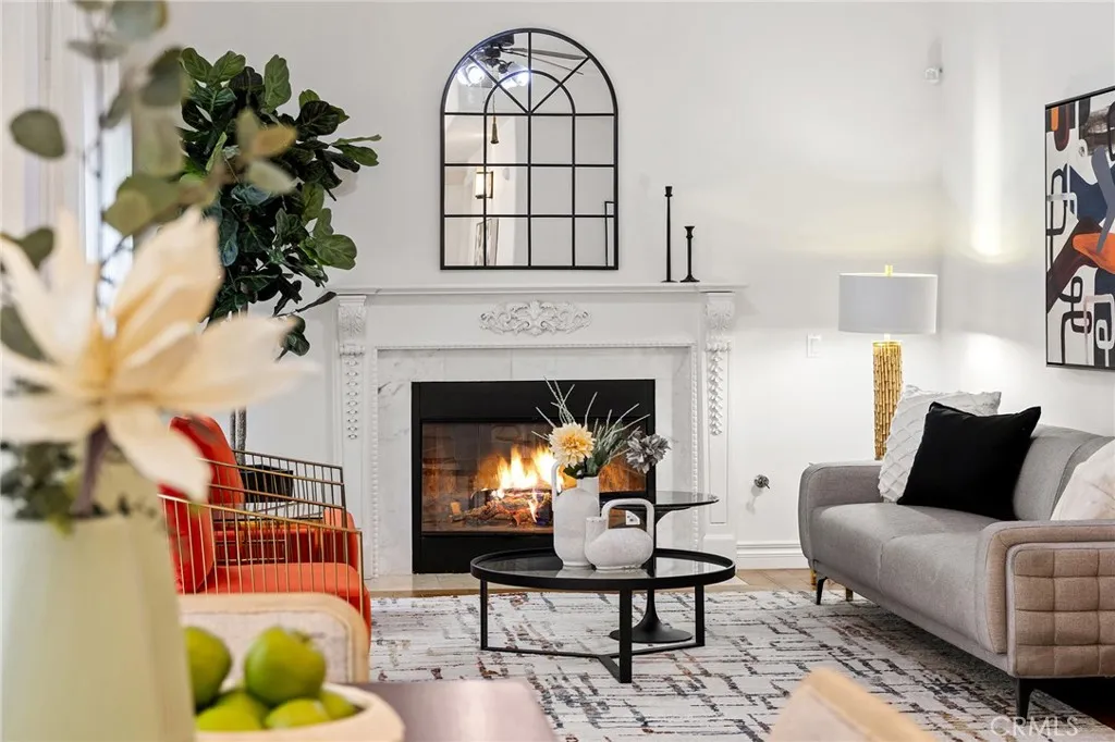 The Expansive family room offers a cozy fireplace with marble-framed, and directly to the beautiful landscaped backyard. The Gourmet Kitchen featuring Caesarstone countertops and stone back splash, built-in stainless steel appliances, custom cabinetry, balancing beauty and functionality.