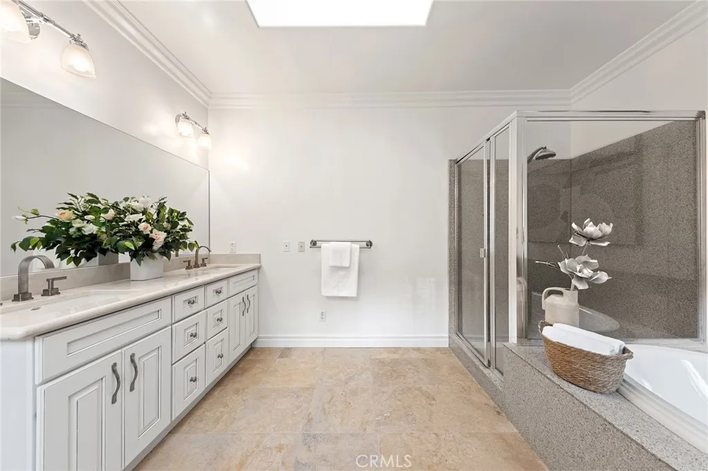 The luxurious upstairs primary suite boasts sitting area, cozy fireplace and walk-in closet. The primary bathroom features dual vanities, bath tub, separate shower, skylights and Travertine floor.