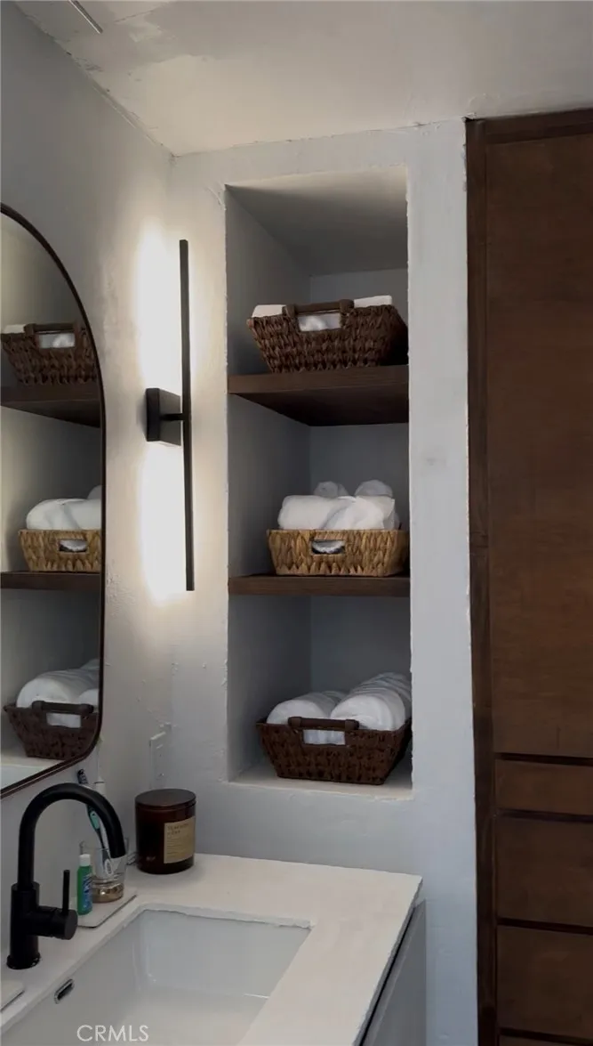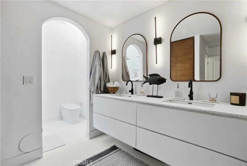 Ascend the decorative tile-riser staircase to the upper level, where the Master Retreat offers a spa-like experience. Beyond the walk-in shower and luminous Venetian plaster, the suite reveals a peekaboo ocean view—a daily connection to the Pacific. Two additional bedrooms share a guest bath, also meticulously redone with Venetian plaster and modern finishes.