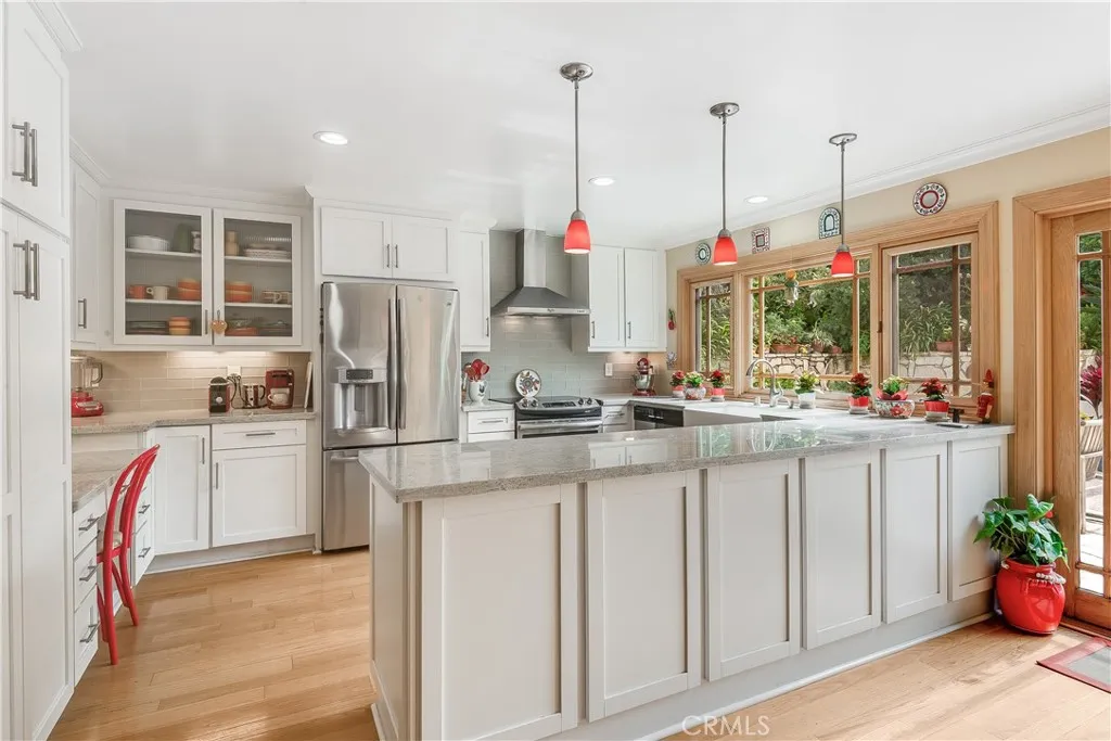 Every drive home begins with expansive ocean views, and as you pull into the driveway, you’re welcomed by charming curb appeal. Inside, warm hardwood floors paired with wood doors and beautiful windows create a bright, modern aesthetic with a sleek sensibility including clean lines, natural textures, and effortless comfort. The spacious living room centers around a Palos Verdes stone fireplace and opens through French doors to the backyard, creating a seamless indoor-outdoor flow. An adjacent formal dining room is ideal for both everyday meals and special gatherings. The light-filled, updated kitchen features granite countertops, new cabinetry, and direct access to the backyard. Completing the circular lower level is a spacious family room, offering a relaxed retreat. Upstairs, five bedrooms include an oversized primary suite with a luxurious bathroom. Outside, enjoy a private backyard oasis with sparkling pool, lush landscaping, and stone decking; it’s your own serene escape. Additional highlights include central A/C, upgraded electrical and plumbing, and inspiring ocean views. Located just moments from top schools, shopping and Hesse Park, this thoughtfully updated home blends timeless comfort with modern simplicity, truly a home that has it all.