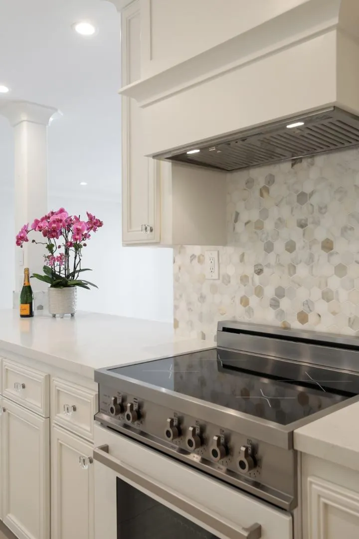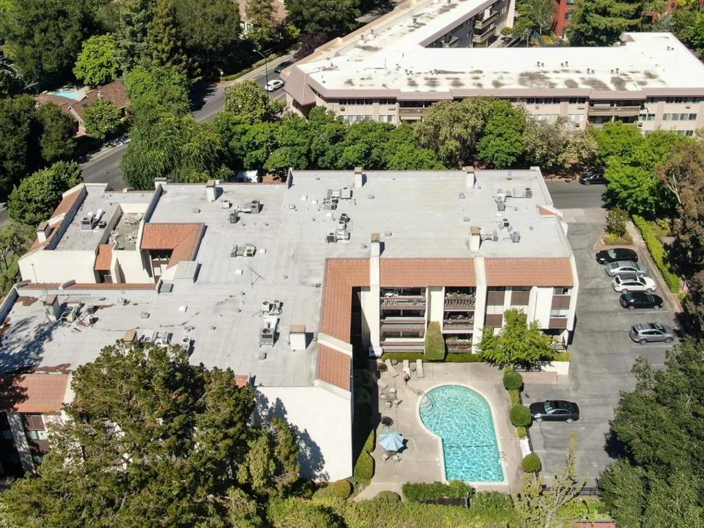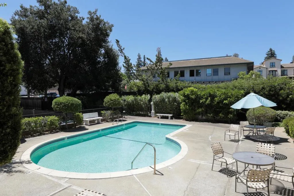 Extensively renovated luxury ground floor condo in the heart of The Village of Los Altos. Elegant all-white kitchen w/breakfast bar + eating area, gorgeous subtle veined countertops, lighted glass display shelves, & sleek European appliances -Bertazonni induction cooktop range & Liebherr refrigerator. Open-plan great room with modern gas fireplace, 85″ flat-screen LCD tv, discreet remote controlled premium window coverings, and sliding door to a private balcony overlooking the community pool. Guest room/office with adjacent full bath. Primary suite with flat-screen LCD tv, sliding patio door, deluxe travertine bath w/double sinks. Fine amenities: chic oversize porcelain tile floors, mirrored closet doors, custom closets, security system, recessed lights, Nest thermostat, full-size washer & dryer in unit, additional balcony storage closets, assigned parking spot in the gated underground garage, elevator, secure building with intercom entrance, plus excellent Los Altos schools!