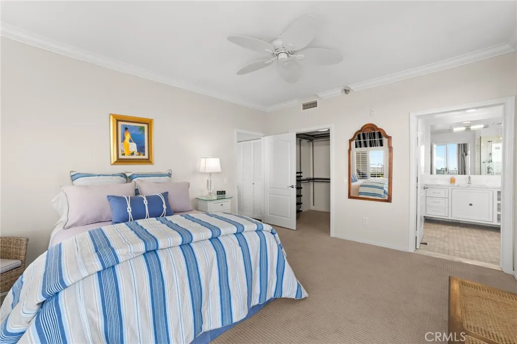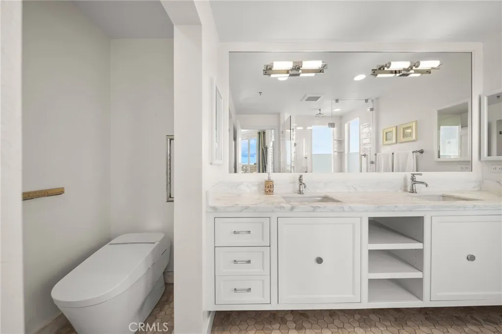 Inside, elegant custom upgrades include rich dark wood flooring in main living areas, crown molding throughout, custom wainscot paneling in the foyer and breakfast room, and a living room fireplace with custom panel detailing. The kitchen features upgraded GE Profile appliances and a built-in pantry with pull-out storage, while the adjacent breakfast room offers plantation shutters and grasscloth wallpaper. The fully remodeled, spa-inspired primary bathroom is a standout, featuring a large curbless shower with frameless glass, grab bars, dual wall and ceiling shower heads, marble accents, a double marble-top vanity, custom linen storage, and a premium Toto Neorest Washlet bidet toilet. The primary bedroom includes newer carpeting, plantation shutters, a custom Elfa closet system, and a wall-mounted TV for easy move-in. A second bathroom offers a walk-in tub, and the oversized second bedroom functions easily as a guest room, den, or office with hillside views. An in-unit washer and dryer add everyday convenience. Residents enjoy fee-simple ownership and resort-style amenities, including meals, housekeeping, 24/7 security, maintenance-free living, all community classes and social activities and close proximity to Dana Point Harbor, beaches, dining, and coastal trails—making this a rare, prime ground-floor offering. PLEASE NOTE THE MANDATORY COMMUNITY MONTHLY SERVICE FEE OF $5,910, as well as MONTHLY HOA of $670, SECOND OCCUPANT FEE of $2,100 applies, if applicable.