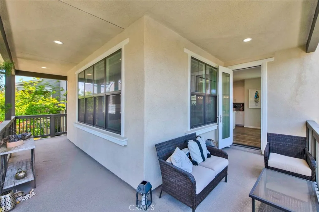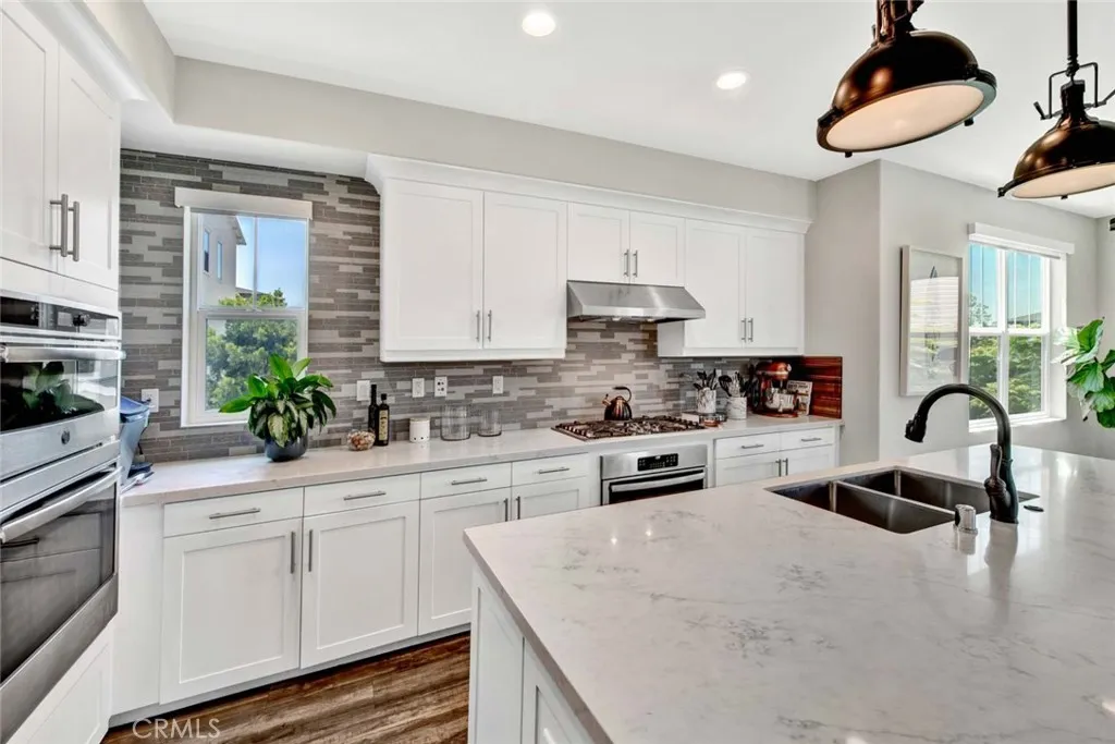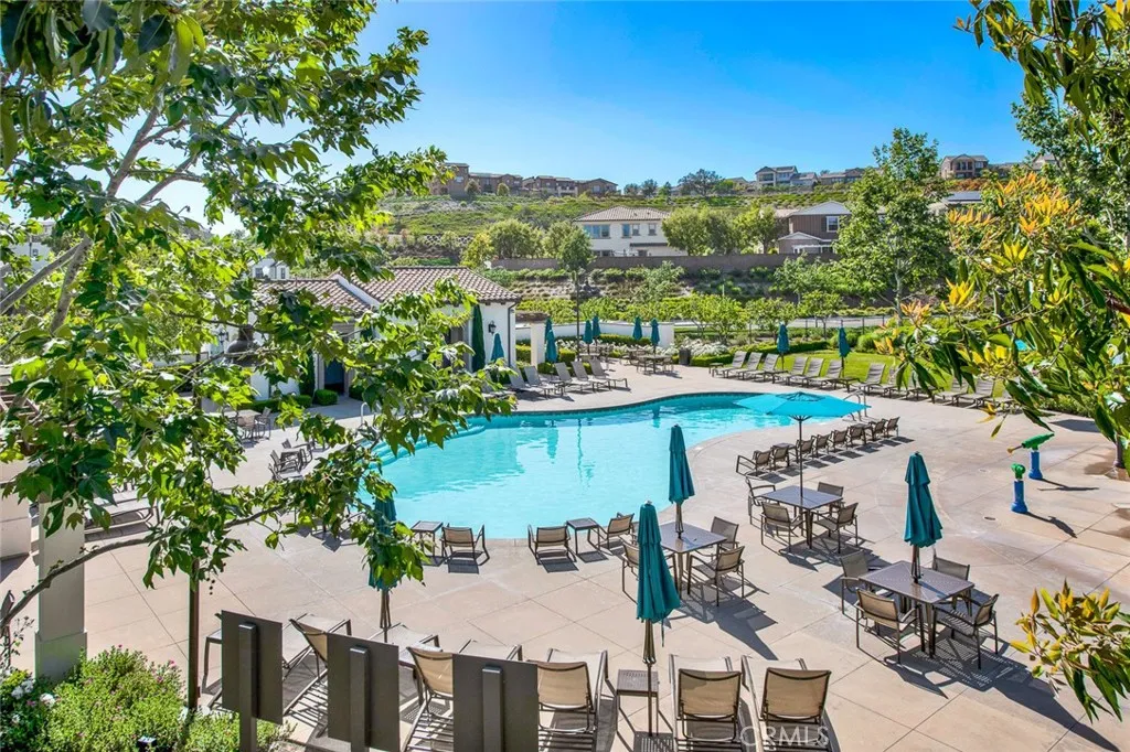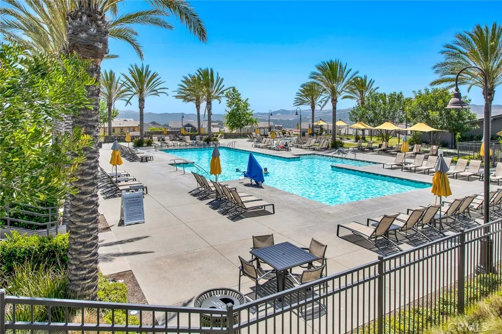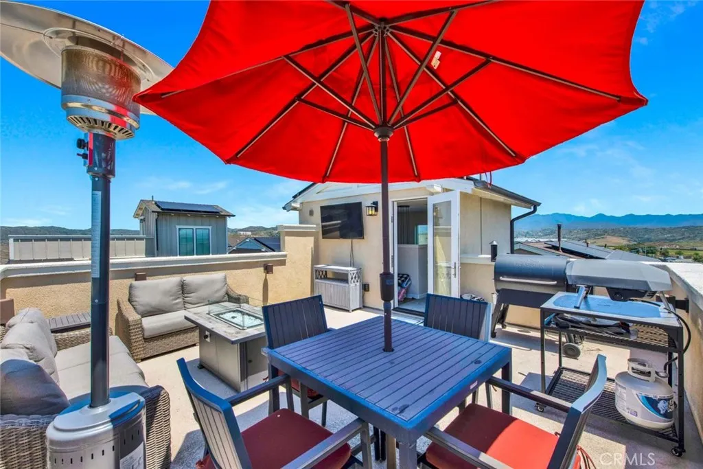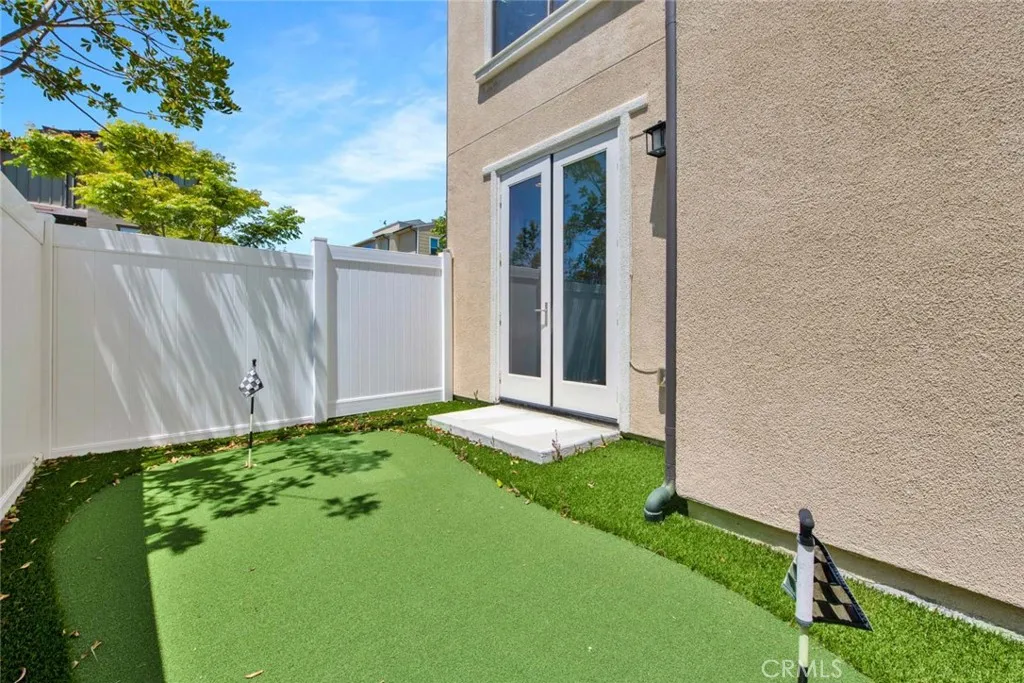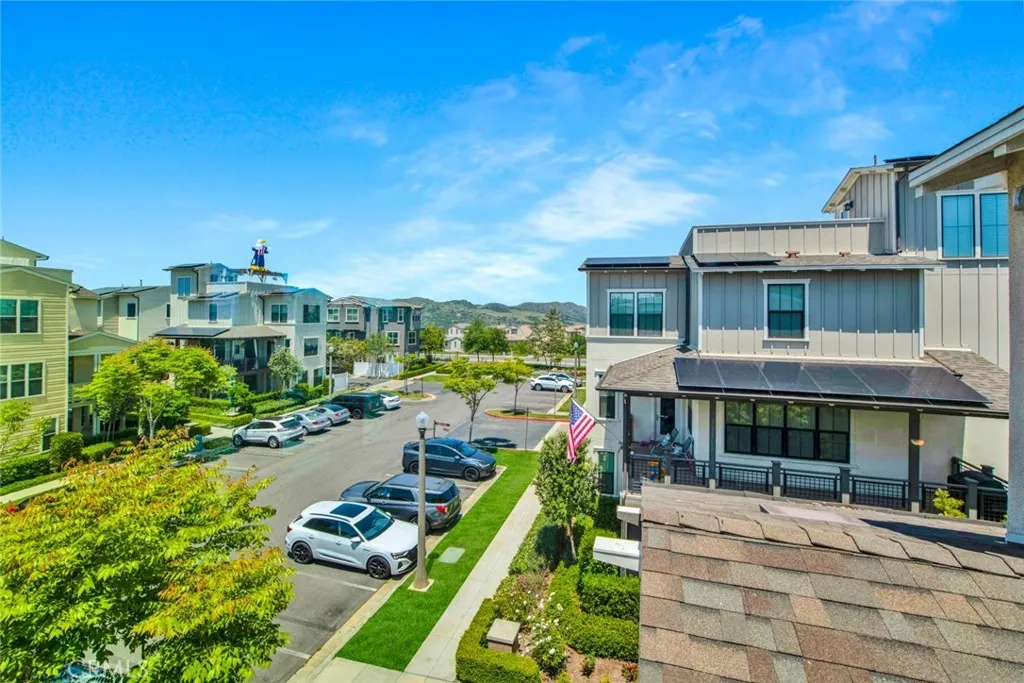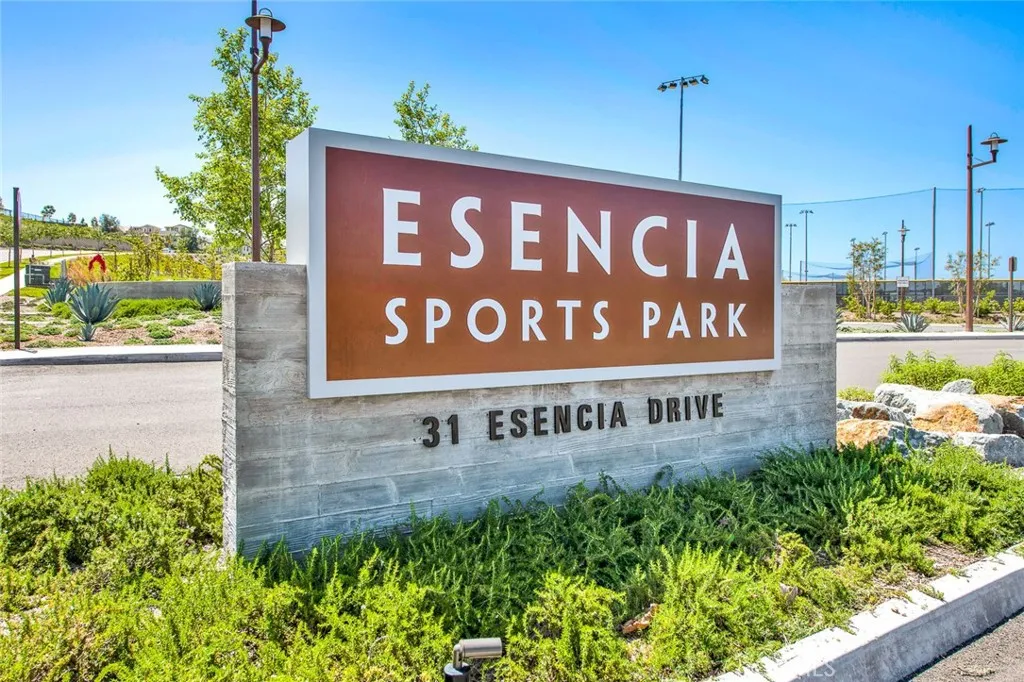 entry that opens to a foyer with a bonus room or living area to the right and just beyond is ensuite bedroom currently used as an office. This can be a full living suite with a living area, bedroom suite with private bath with walk-in shower, a separate entrance and access to the yard with a putting green through double French doors. On the second level, you find an open concept living area with a grand gourmet kitchen with a large island offering bar seating for four. Stainless steel appliances include a 5 burner gas cooktop, 2 gas ovens, microwave oven, dishwasher and a French door refrigerator with water in the door. The kitchen also features pristine white Shaker style cabinets topped with quartz counter tops with a random pattern tile strip backsplash. There’s a spacious dining room with a contemporary chandelier and access to the wrap around balcony. The adjacent living room has a fireplace and overlooks the wrap around front balcony. There are also powder and laundry rooms on this level. On the third level, there’s a sumptuous owner’s suite with a huge walk-in closet and an opulent private bath featuring a walk-in shower, double vanity, luxurious soaking tub and a privacy door to the commode. There are also 2 spacious secondary bedrooms with ample closet space that share a full bath. Another flight of stairs takes you to a wonderful roof top patio with an indoor wet bar, and abundant space for an outdoor seating area and a dining area, plus plenty of room for your outdoor appliances. There are 2 ground level patio areas including the putting green off the main floor suite and a lush garden area on the opposite side. The attached 2 car garage has direct access to the ground level foyer and an EV charger. For families with school age children, Esencia K-8 is within the development, and Tesoro High School is less than 10 minutes away! Nearby shopping & dining is also just minutes away. With so many things to do in your own neighborhood,you’ll never want to leave! This is a wonderful place to call home. Come make it yours!