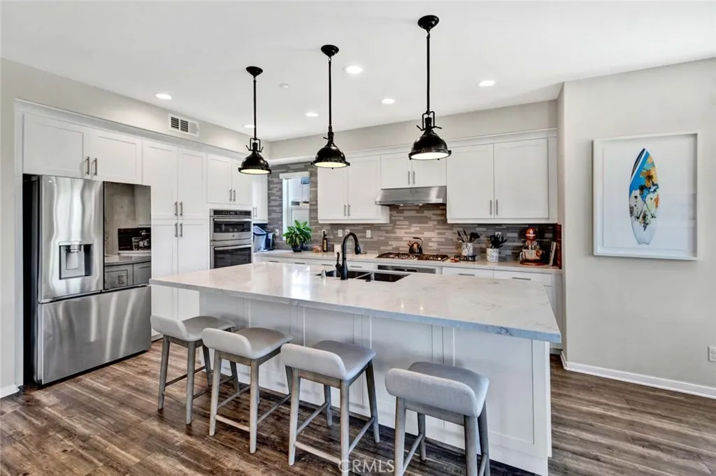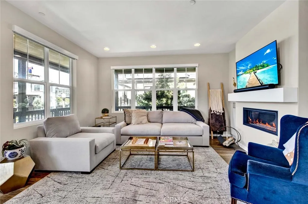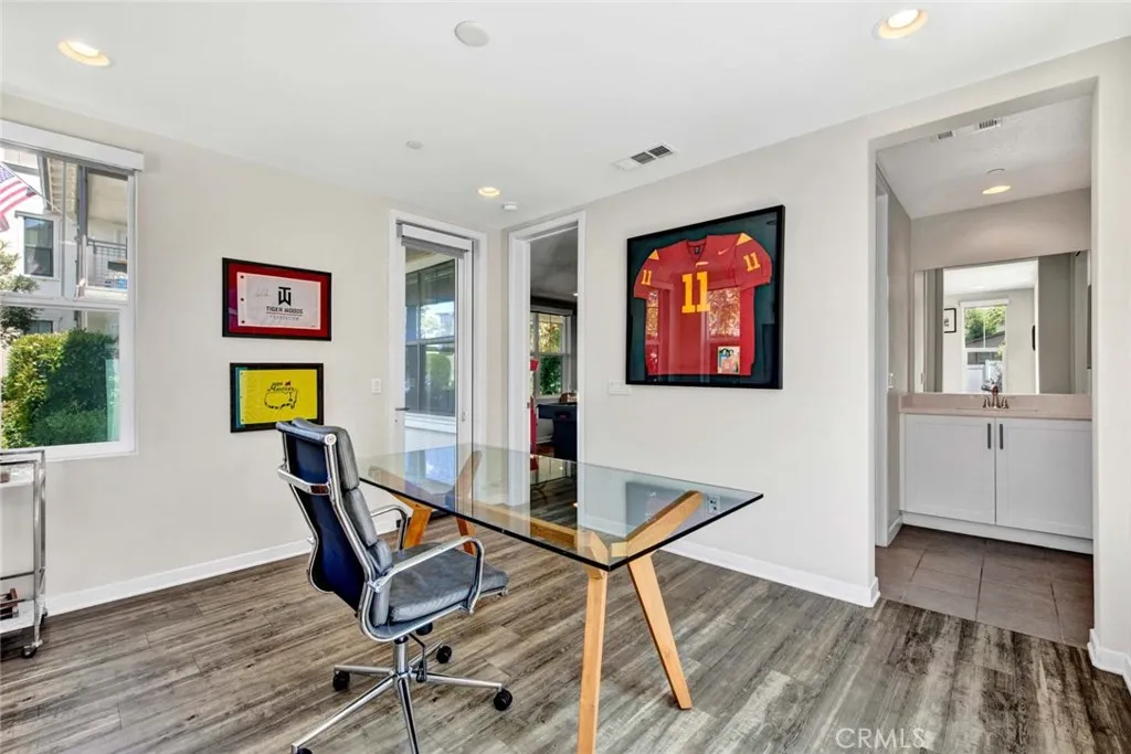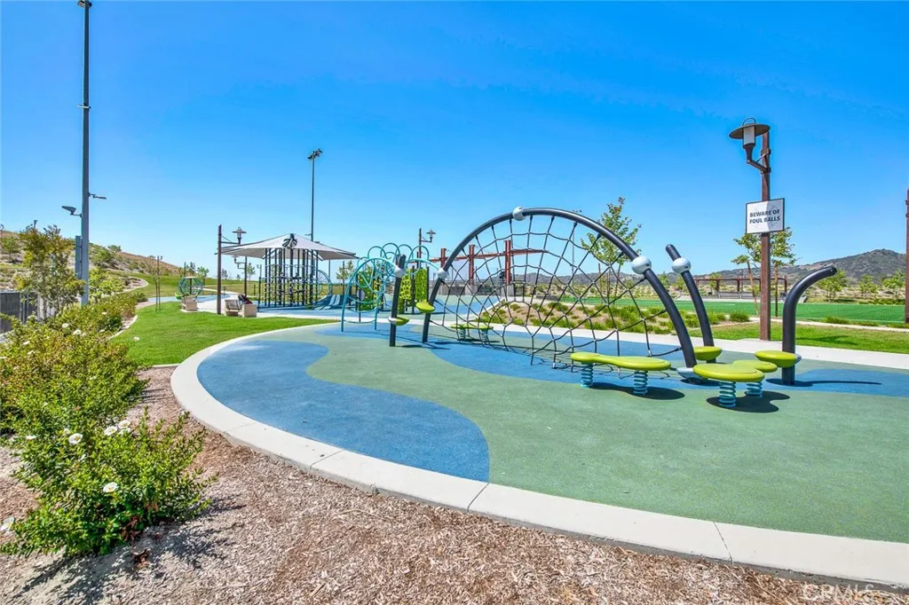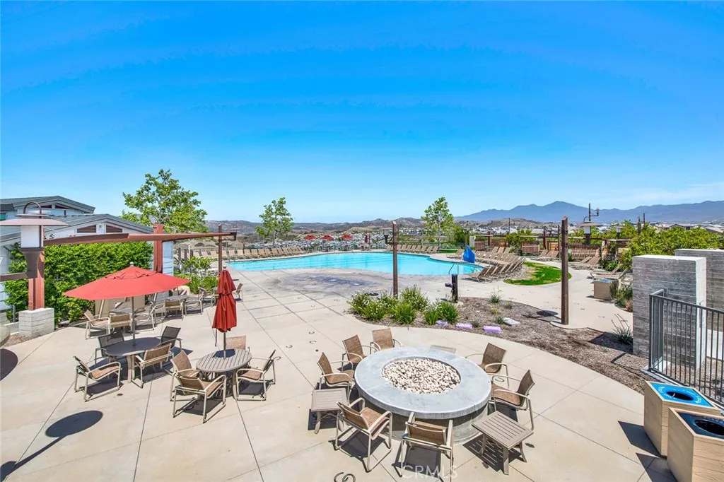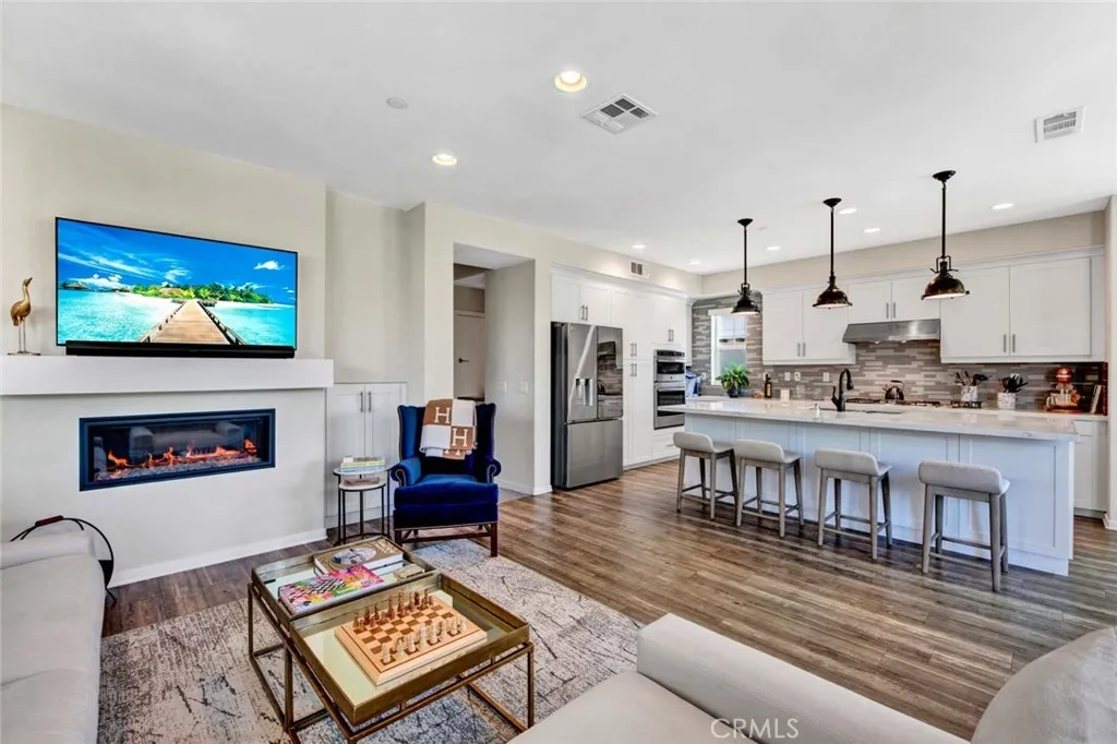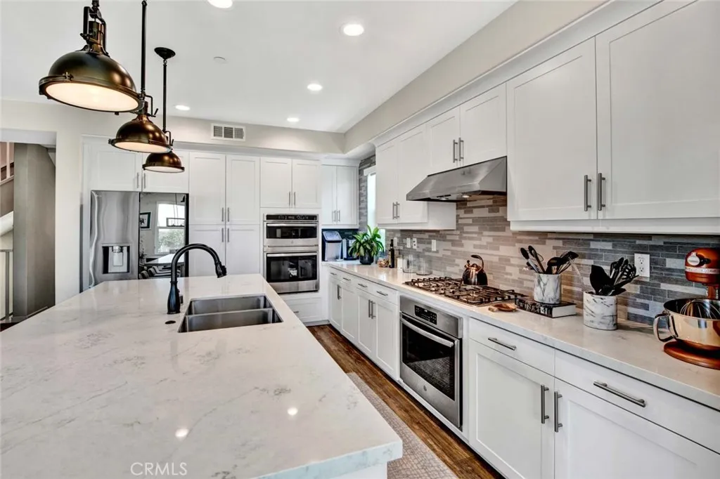 entry that opens to a foyer with a bonus room or living area to the right and just beyond is ensuite bedroom currently used as an office. This can be a full living suite with a living area, bedroom suite with private bath with walk-in shower, a separate entrance and access to the yard with a putting green through double French doors. On the second level, you find an open concept living area with a grand gourmet kitchen with a large island offering bar seating for four. Stainless steel appliances include a 5 burner gas cooktop, 2 gas ovens, microwave oven, dishwasher and a French door refrigerator with water in the door. The kitchen also features pristine white Shaker style cabinets topped with quartz counter tops with a random pattern tile strip backsplash. There’s a spacious dining room with a contemporary chandelier and access to the wrap around balcony. The adjacent living room has a fireplace and overlooks the wrap around front balcony. There are also powder and laundry rooms on this level. On the third level, there’s a sumptuous owner’s suite with a huge walk-in closet and an opulent private bath featuring a walk-in shower, double vanity, luxurious soaking tub and a privacy door to the commode. There are also 2 spacious secondary bedrooms with ample closet space that share a full bath. Another flight of stairs takes you to a wonderful roof top patio with an indoor wet bar, and abundant space for an outdoor seating area and a dining area, plus plenty of room for your outdoor appliances. There are 2 ground level patio areas including the putting green off the main floor suite and a lush garden area on the opposite side. The attached 2 car garage has direct access to the ground level foyer and an EV charger. For families with school age children, Esencia K-8 is within the development, and Tesoro High School is less than 10 minutes away! Nearby shopping & dining is also just minutes away. With so many things to do in your own neighborhood,you’ll never want to leave! This is a wonderful place to call home. Come make it yours!