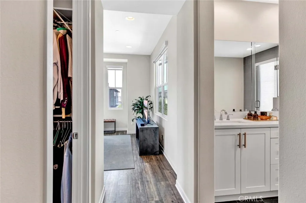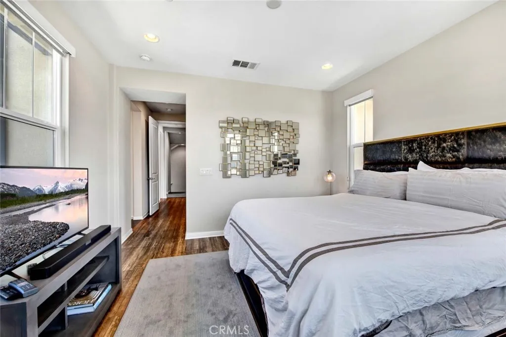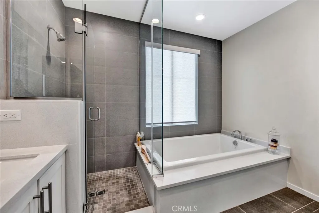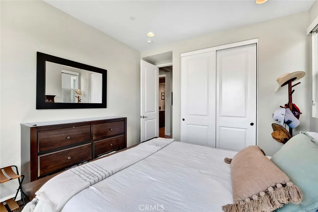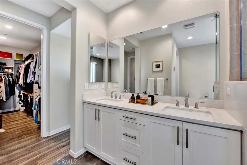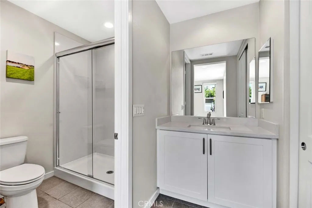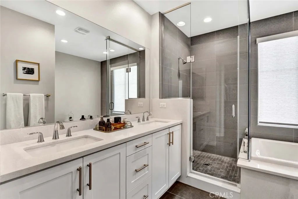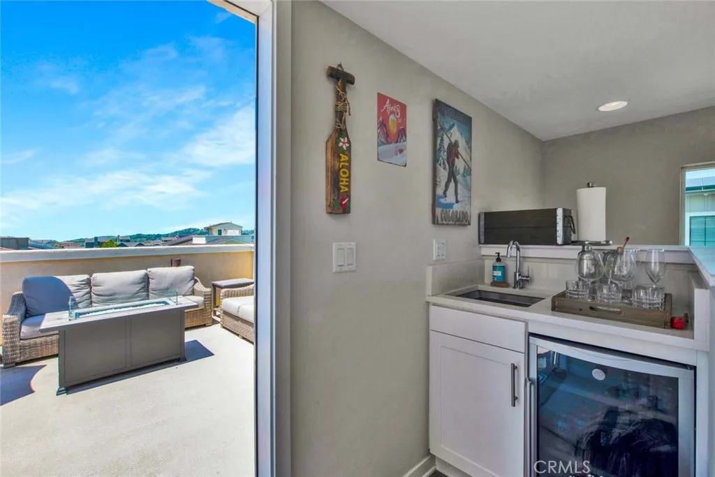 entry that opens to a foyer with a bonus room or living area to the right and just beyond is ensuite bedroom currently used as an office. This can be a full living suite with a living area, bedroom suite with private bath with walk-in shower, a separate entrance and access to the yard with a putting green through double French doors. On the second level, you find an open concept living area with a grand gourmet kitchen with a large island offering bar seating for four. Stainless steel appliances include a 5 burner gas cooktop, 2 gas ovens, microwave oven, dishwasher and a French door refrigerator with water in the door. The kitchen also features pristine white Shaker style cabinets topped with quartz counter tops with a random pattern tile strip backsplash. There’s a spacious dining room with a contemporary chandelier and access to the wrap around balcony. The adjacent living room has a fireplace and overlooks the wrap around front balcony. There are also powder and laundry rooms on this level. On the third level, there’s a sumptuous owner’s suite with a huge walk-in closet and an opulent private bath featuring a walk-in shower, double vanity, luxurious soaking tub and a privacy door to the commode. There are also 2 spacious secondary bedrooms with ample closet space that share a full bath. Another flight of stairs takes you to a wonderful roof top patio with an indoor wet bar, and abundant space for an outdoor seating area and a dining area, plus plenty of room for your outdoor appliances. There are 2 ground level patio areas including the putting green off the main floor suite and a lush garden area on the opposite side. The attached 2 car garage has direct access to the ground level foyer and an EV charger. For families with school age children, Esencia K-8 is within the development, and Tesoro High School is less than 10 minutes away! Nearby shopping & dining is also just minutes away. With so many things to do in your own neighborhood,you’ll never want to leave! This is a wonderful place to call home. Come make it yours!