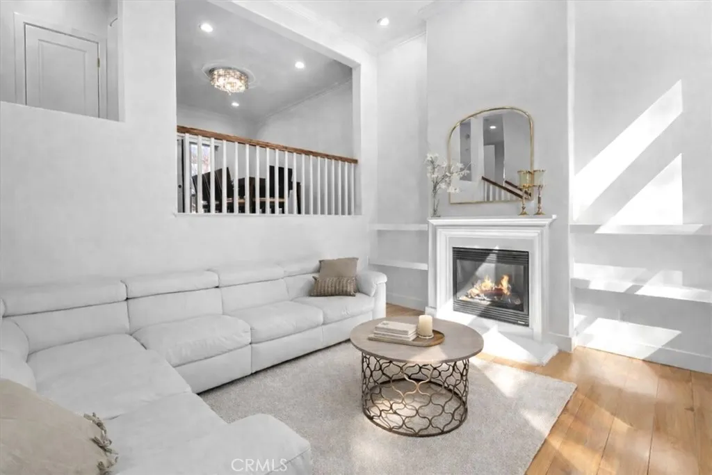A gated front patio welcomes you into a dramatic living room with soaring ceilings and a fireplace, creating a warm and inviting first impression. The formal dining room opens to a generous balcony for effortless indoor-outdoor entertaining, while the expansive family room flows seamlessly into the gourmet eat-in kitchen featuring quartz countertops, stainless steel appliances, a walk-in pantry, and a large center island.