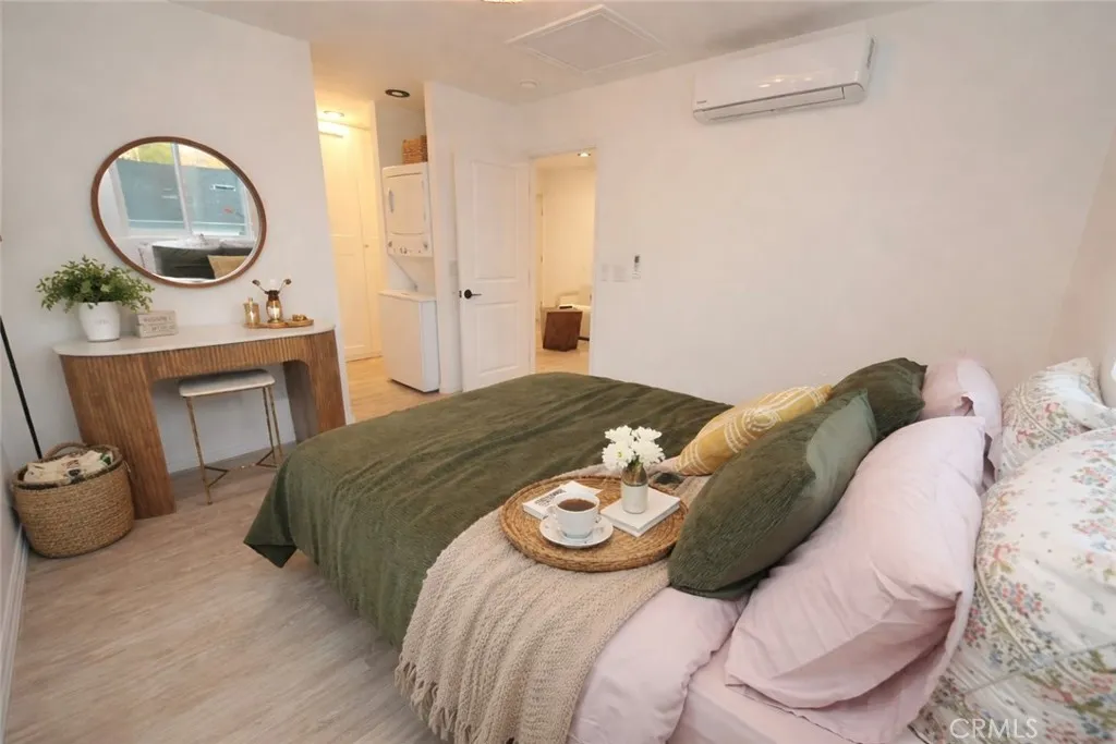 The fully permitted second-floor ADU (approx. 425 sq ft) built in 2025, features a private 1-bed/1-bath layout with kitchen, in-unit laundry, tankless water heater, separate HVAC, private entrance, and side yard.
