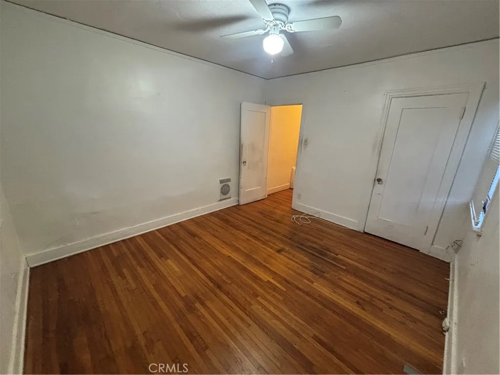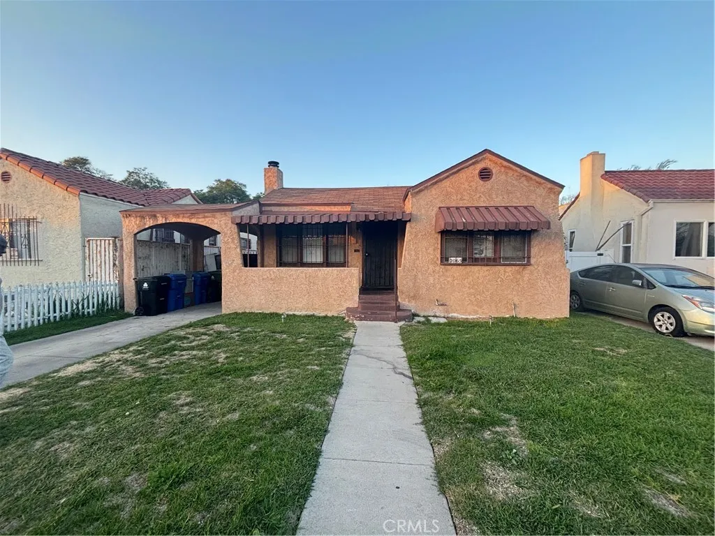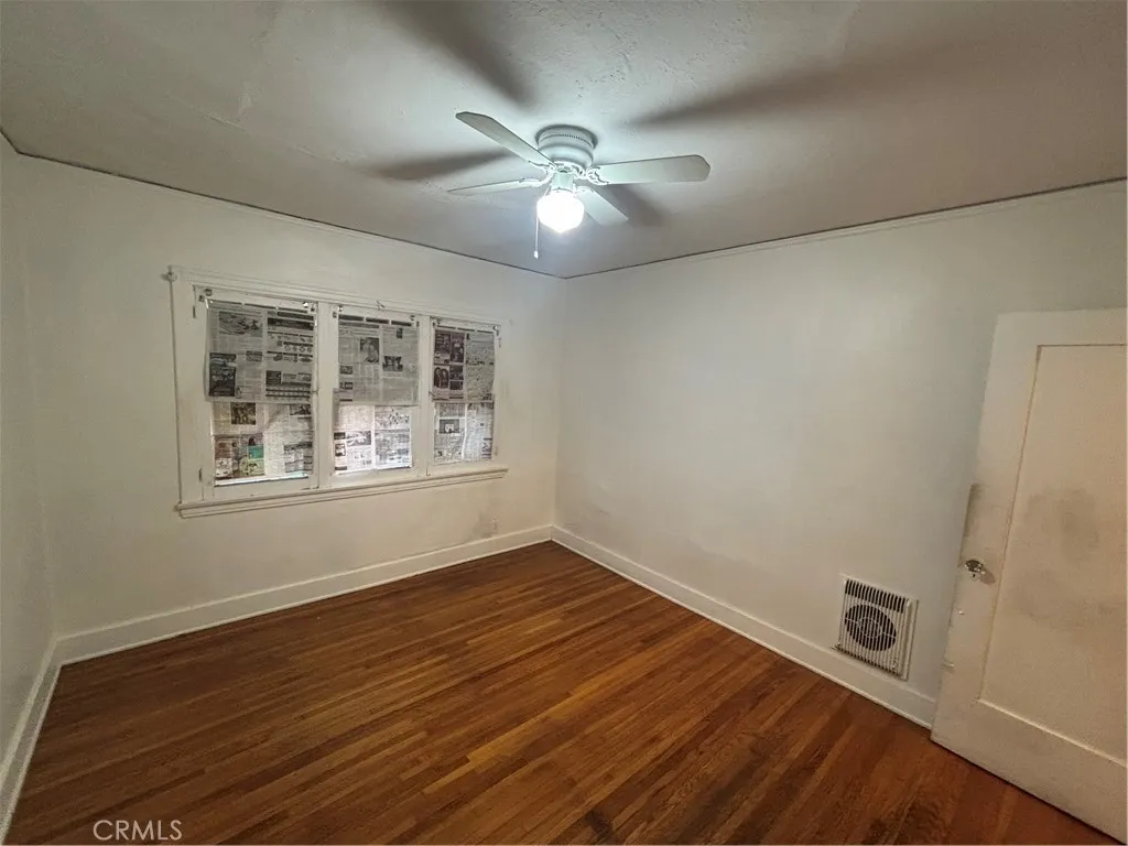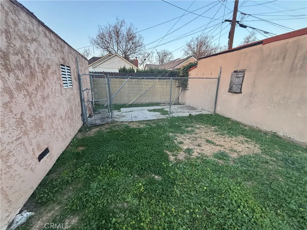 A convenient service porch with laundry hookups leads directly to the backyard. The home features two spacious bedrooms, each with walk-in closets, and a centrally located tiled bathroom with a shower-over-tub combination.