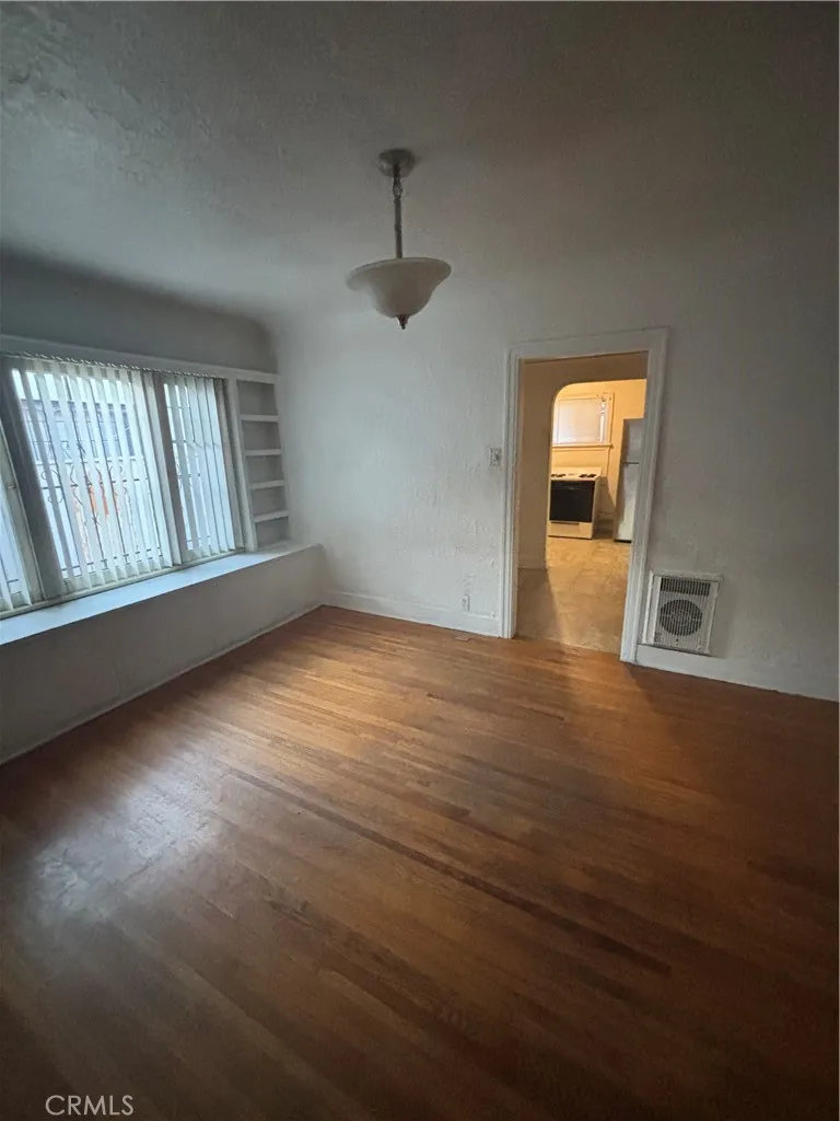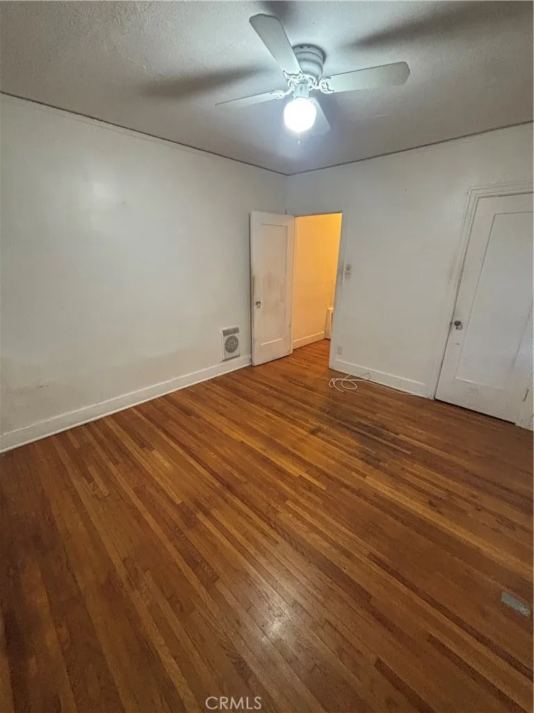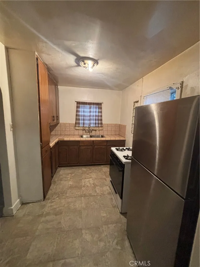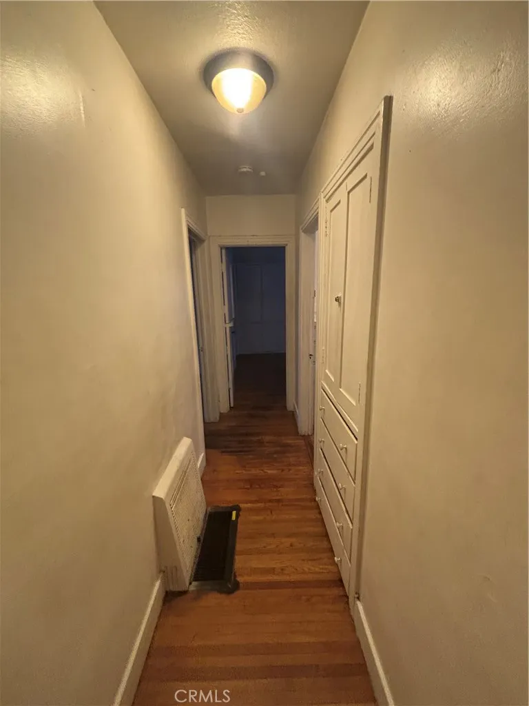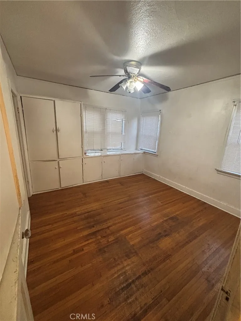 A convenient service porch with laundry hookups leads directly to the backyard. The home features two spacious bedrooms, each with walk-in closets, and a centrally located tiled bathroom with a shower-over-tub combination.