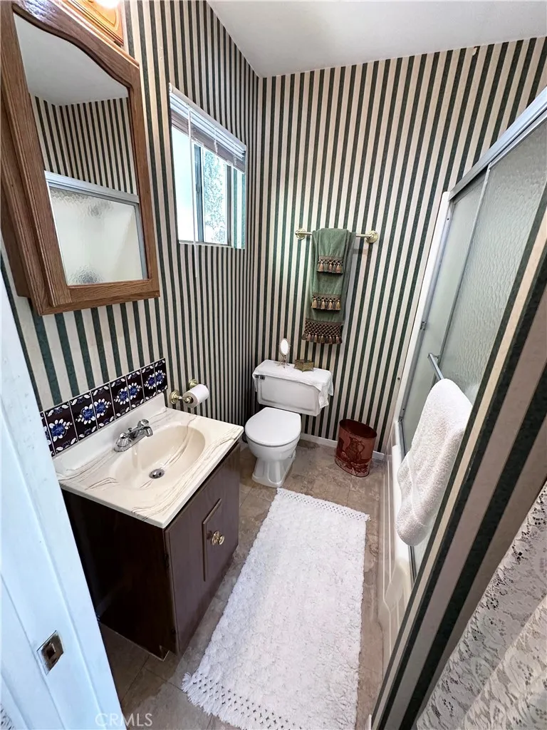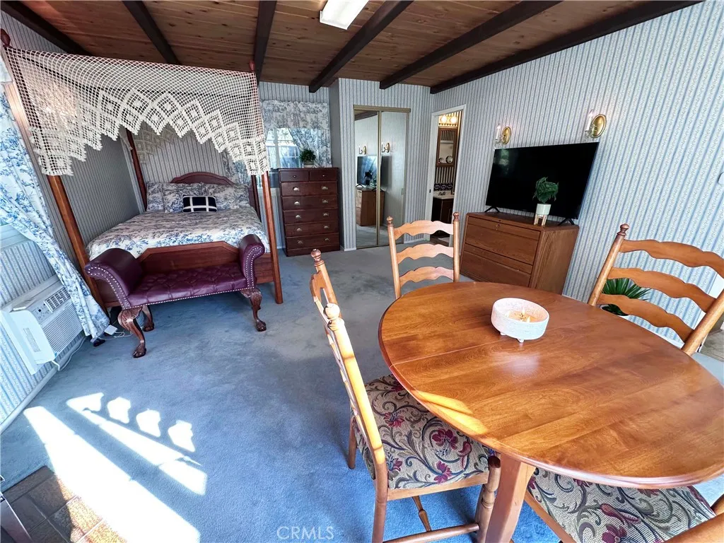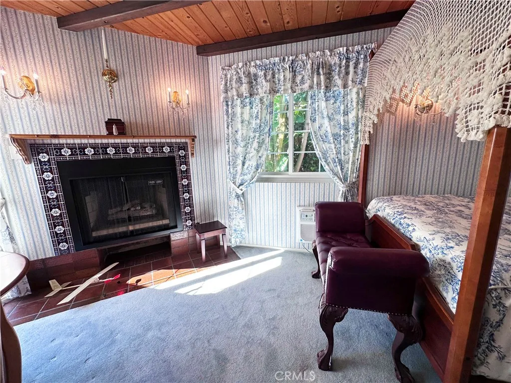 The interior showcases beautiful vintage wallpaper details, classic design elements, and a charming fireplace that adds warmth and ambiance. The dining area features double doors that open to the patio, allowing abundant natural sunlight to fill the space while offering lovely outdoor views.
