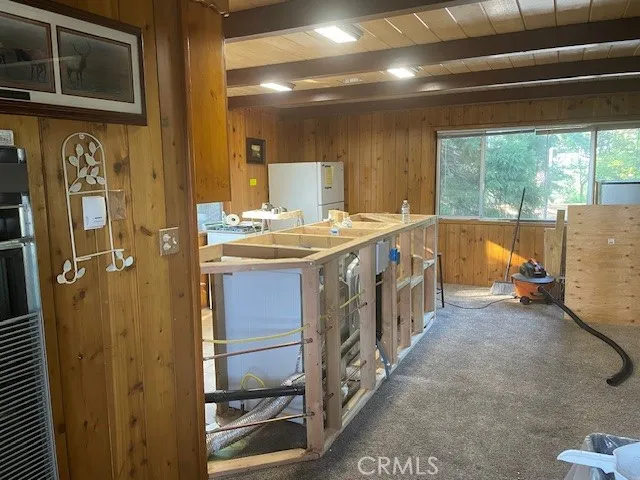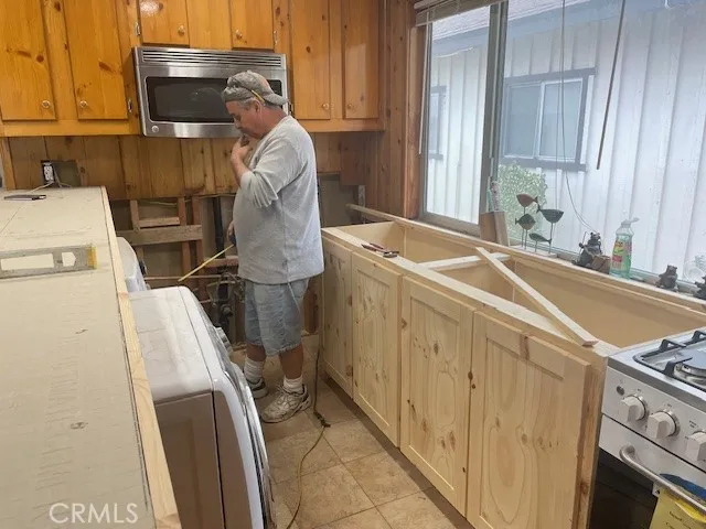 country kitchen with knotty Cedar walls and ceiling. 36” stainless steel stove, dishwasher, washer and dryer. Large living
