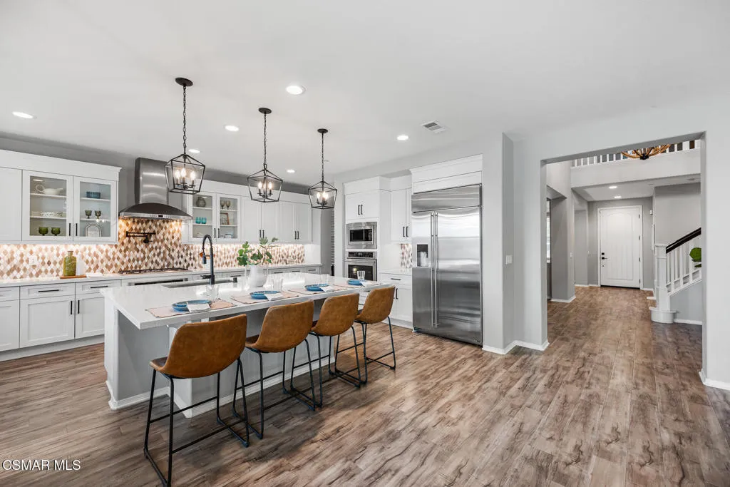 An exceptional opportunity within the gated Meridians of Moorpark. Built in 2017, this impressive cul-de-sac residence offers five bedrooms, five bathrooms, and over 3,800 square feet of open, thoughtfully designed living space. The home feels expansive yet inviting, with wood-like flooring, recessed lighting throughout, and generously sized rooms that flow effortlessly from one to the next.The designer kitchen serves as the heart of the home, showcasing a large center island with breakfast bar and pendant lighting, custom tile accents, quartz countertops, bright white cabinetry, and stainless steel appliances. A pot filler at the range adds both convenience and style, while the casual dining area creates an ideal setting for everyday living or intimate gatherings.A grand staircase leads upstairs to a versatile loft and well-appointed bedrooms, many enjoying scenic views of the surrounding hills. The primary suite offers a peaceful retreat, complete with dual sinks, tile flooring, a separate shower, and a sunken soaking tub designed for true relaxation.The backyard is designed for effortless entertaining and quiet moments alike, featuring a spacious paver patio, built-in fire pit with bench seating, custom decking, and a covered patio, all set against sweeping panoramic mountain and hillside views. Located within a secure gated community, this newer home combines space, comfort, and elevated design–creating a setting that feels as impressive as it is easy to enjoy.