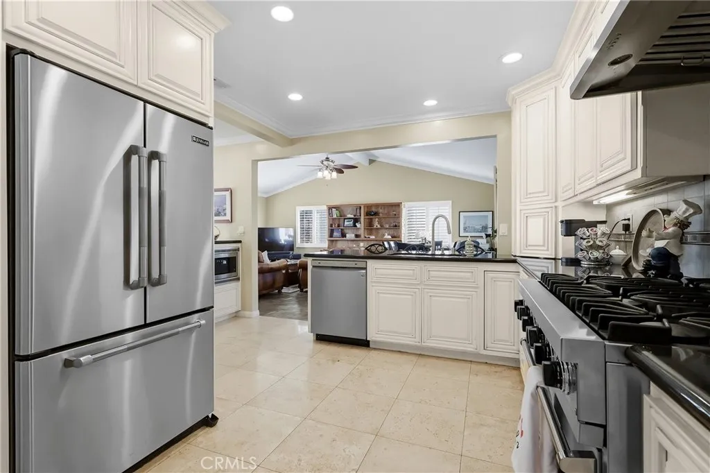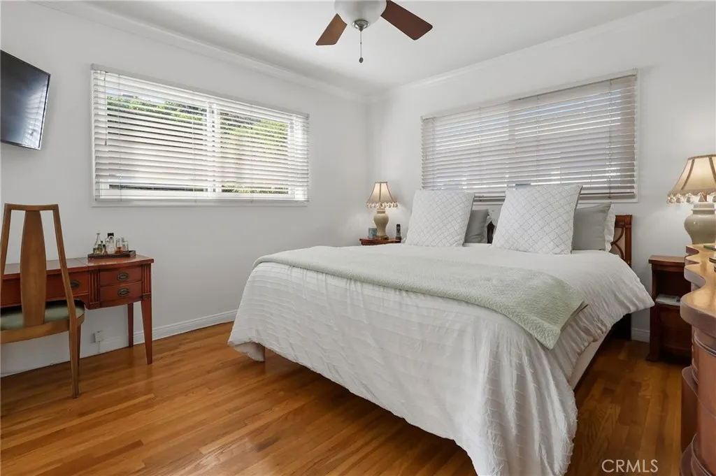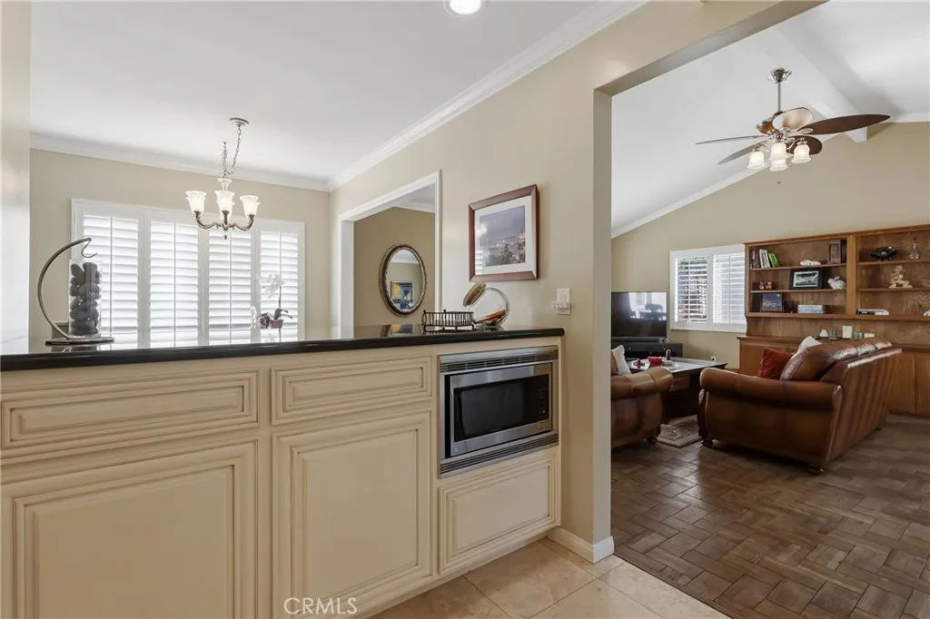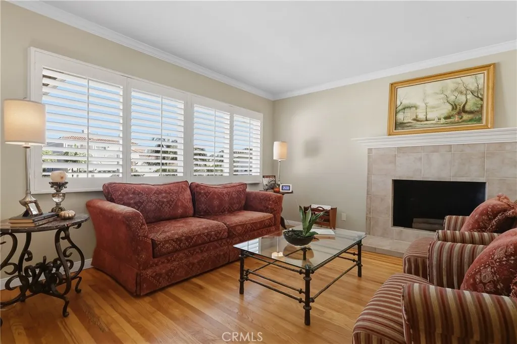 Additional amenities include plantation shutters, central heating and air conditioning, and copper plumbing (buyer to verify), ensuring comfort and peace of mind. The attached two-car garage offers direct interior access along with a designated laundry area for added convenience. Outdoors, the low-maintenance backyard is designed for refined entertaining or quiet relaxation under the Southern California sun. An expansive driveway provides generous off-street parking. This is a rare opportunity to acquire a distinguished pride-of-ownership home in a premier location — a residence defined by quality, comfort, and enduring elegance.